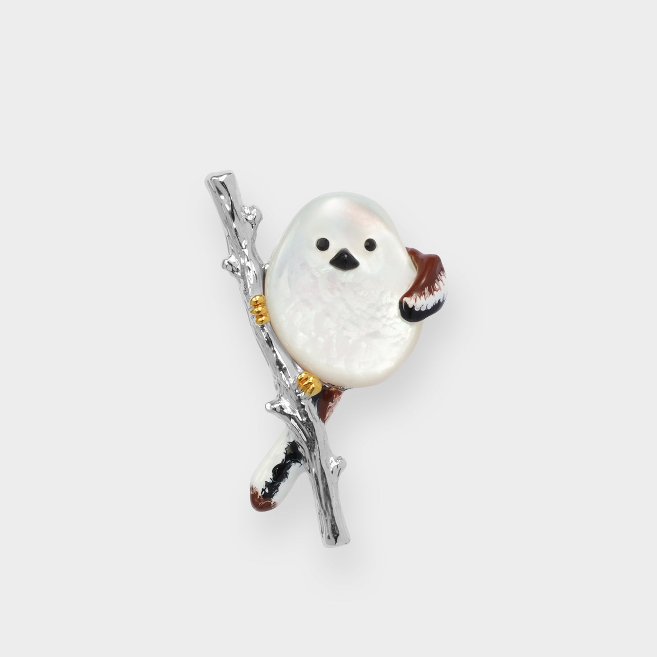 「冬の妖精」とも呼ばれるシマエナガのブローチ。枝で羽を休めてリラックスする愛らしい姿をデザインしました。