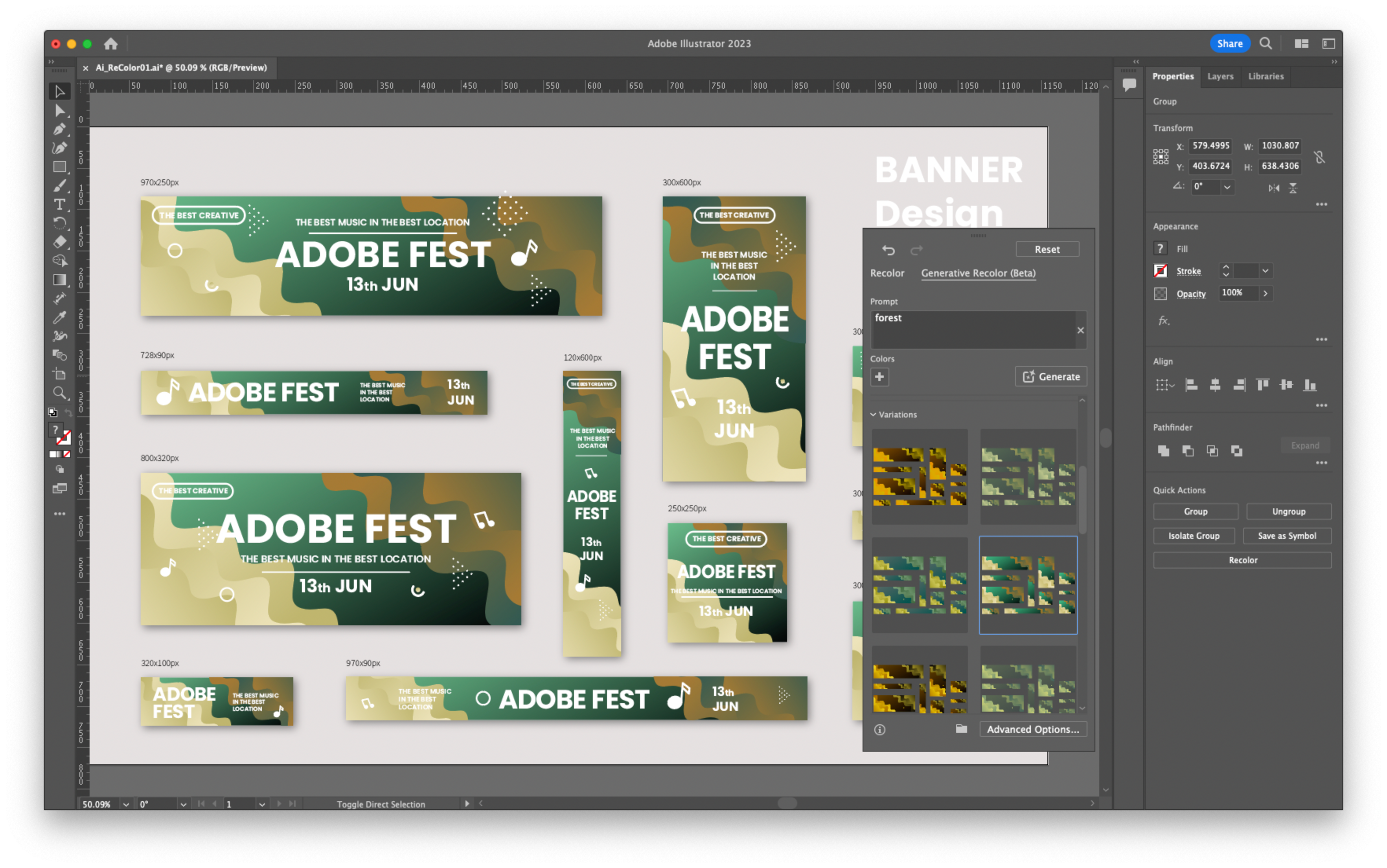 本日発表した「Generative Recolor」は「正午の砂漠」や「真夜中のジャングル」のように、言葉で表現されたイメージの本質を捉えてカスタムするカラーテーマを生成し、ベクターアートワークに適用します。シンプルなテキストプロンプトの入力だけで、複雑なベクターグラフィックに自動的にカラーを一斉適用できるこの先進的な機能により、アーティストは個々のベクターを手動で修正する必要がなく、時間を節約できます。これにより、ブランドアイデンティティから広告・マーケティング用のグラフィック、デジタルドローイングやイラストレーション、インスピレーションやムードボードの作成まで、クリエイティブなプロセスを劇的に効率化します。デザイナーは、1つの製品パッケージデザインからいくつものカラーバリエーションを作成してテストしたり、特定の季節や祝日ごとに異なるバリエーションの広告を作成したり、無数のカラーコンビネーションによるイラストの制作が可能になります。