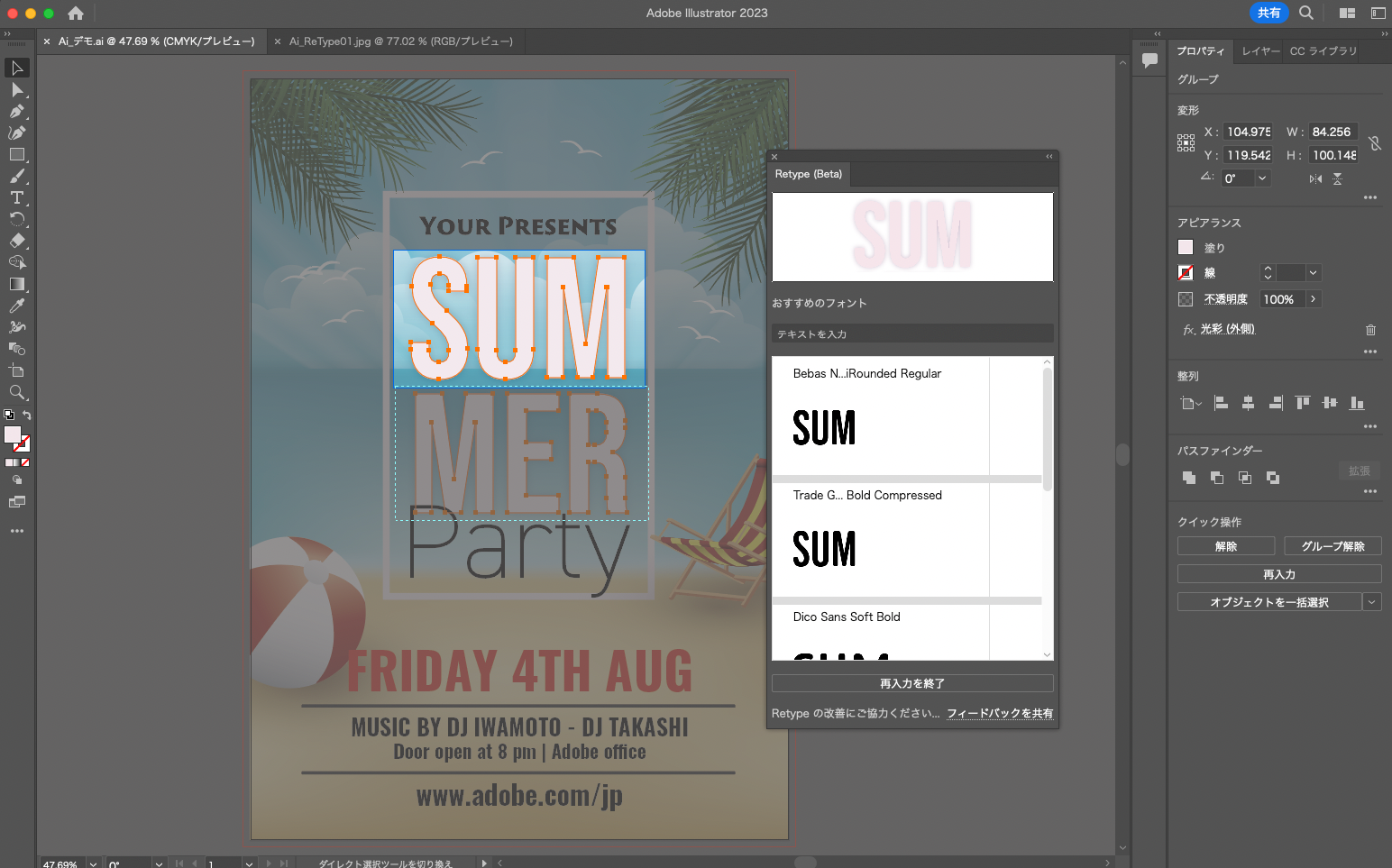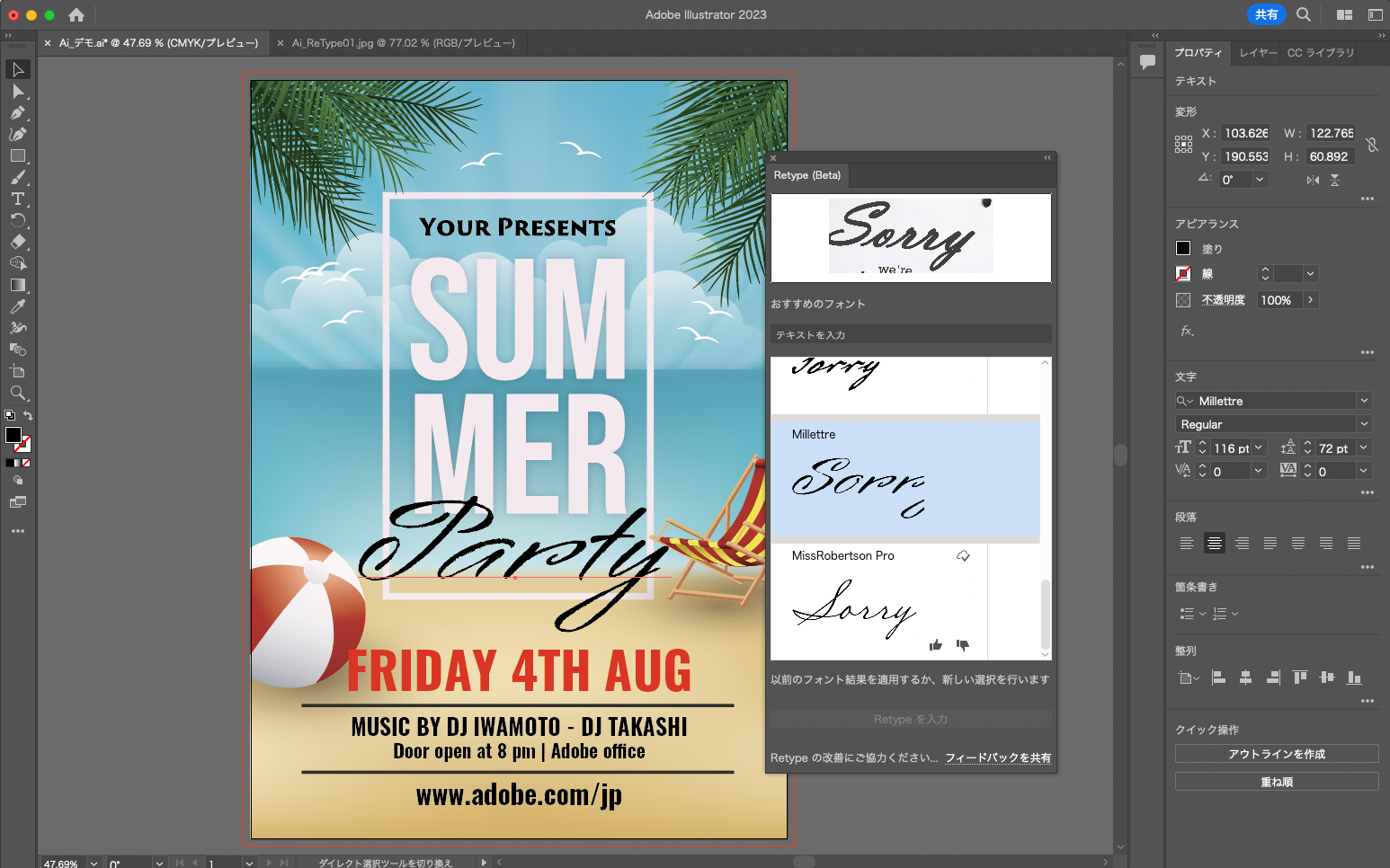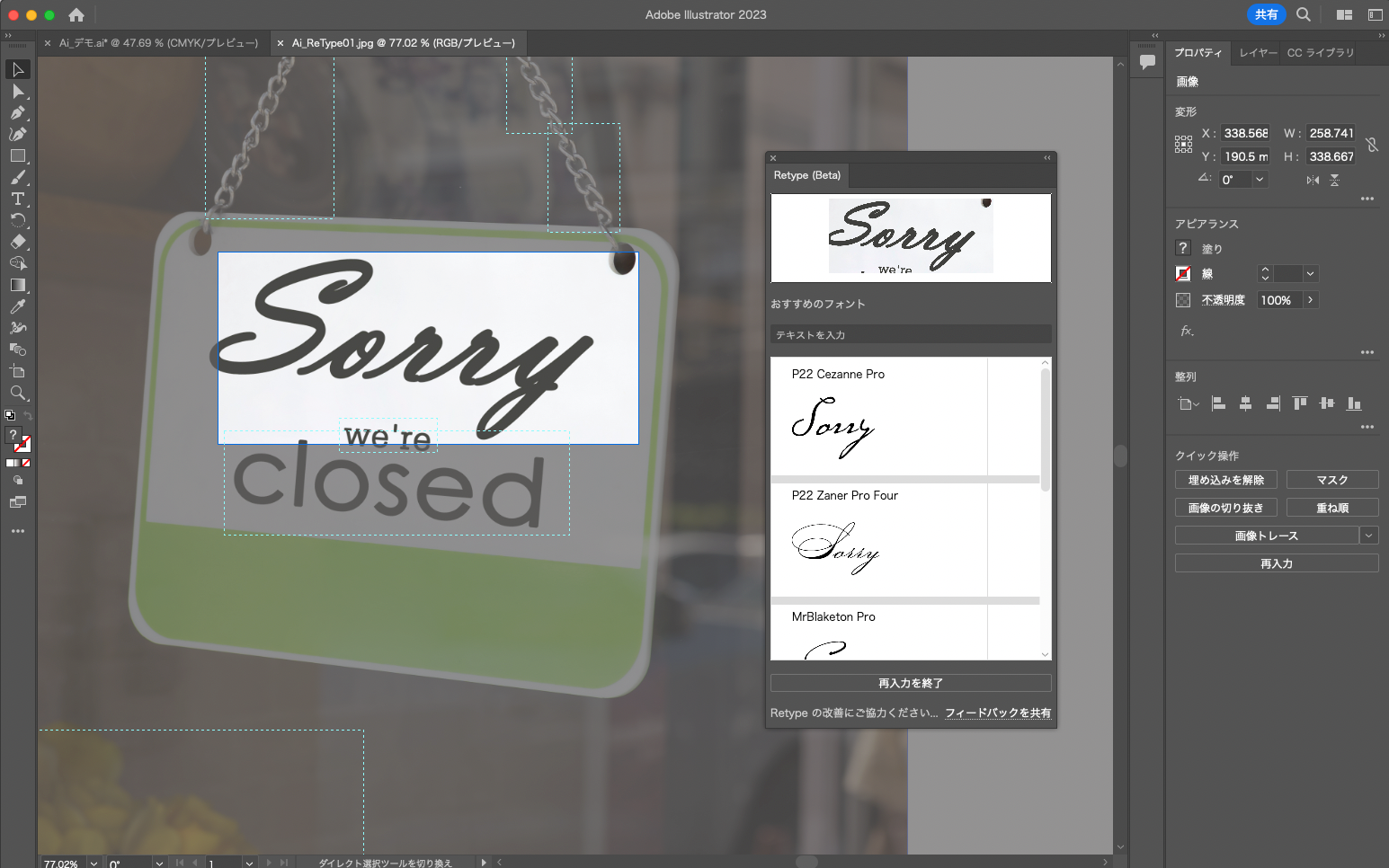 最新バージョンのAdobe Illustratorは、新しいレイヤー機能や画像トレース機能の強化も含め、本日より公開を開始しています。また、Adobe Fireflyの機能「Generative Recolor」は英語版のIllustrator(ベータ版)として搭載されます。日本語版への搭載は後日を予定しております。また新機能の「ReType(フォントの再編集)」は、日本語版でもベータ版として搭載されています。