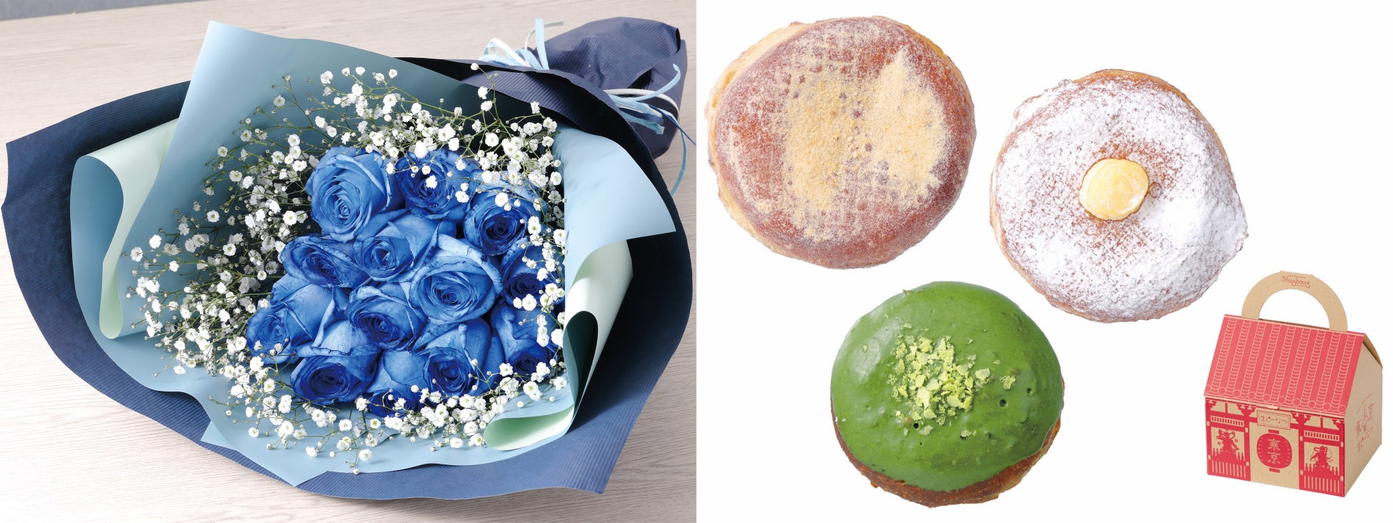 左:ブルーバラ13本の花束(かすみ草入り) ¥13,000 フラワーデコ(イーストヤード1階) ソラマチ限定