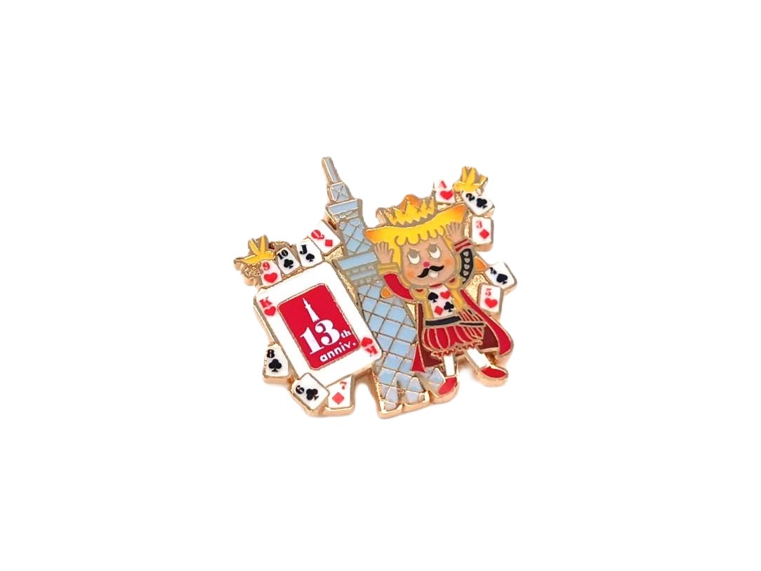 キングに変身したソラカラちゃんとスカイツリーがデザインされたピンズ。輝くゴールドカラー。