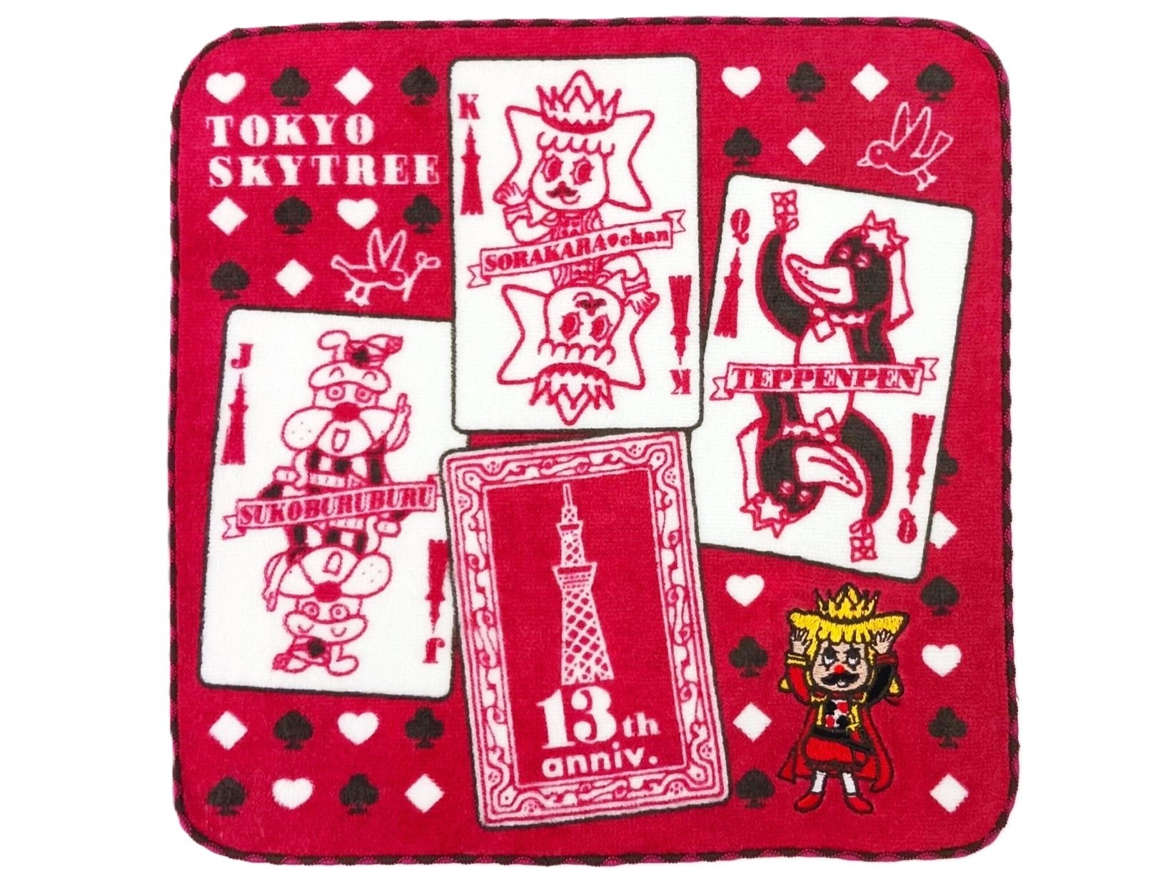 キングに変身したソラカラちゃんの刺繍がワンポイントで入った、トランプ柄のミニタオル。