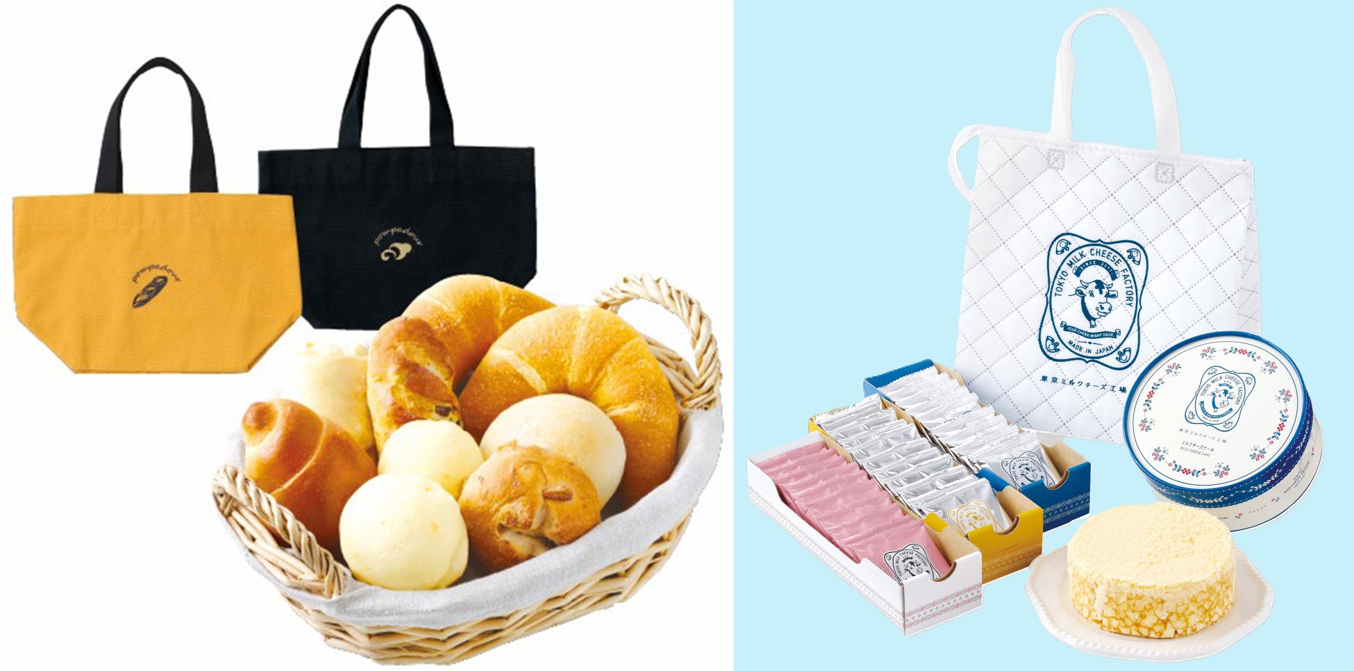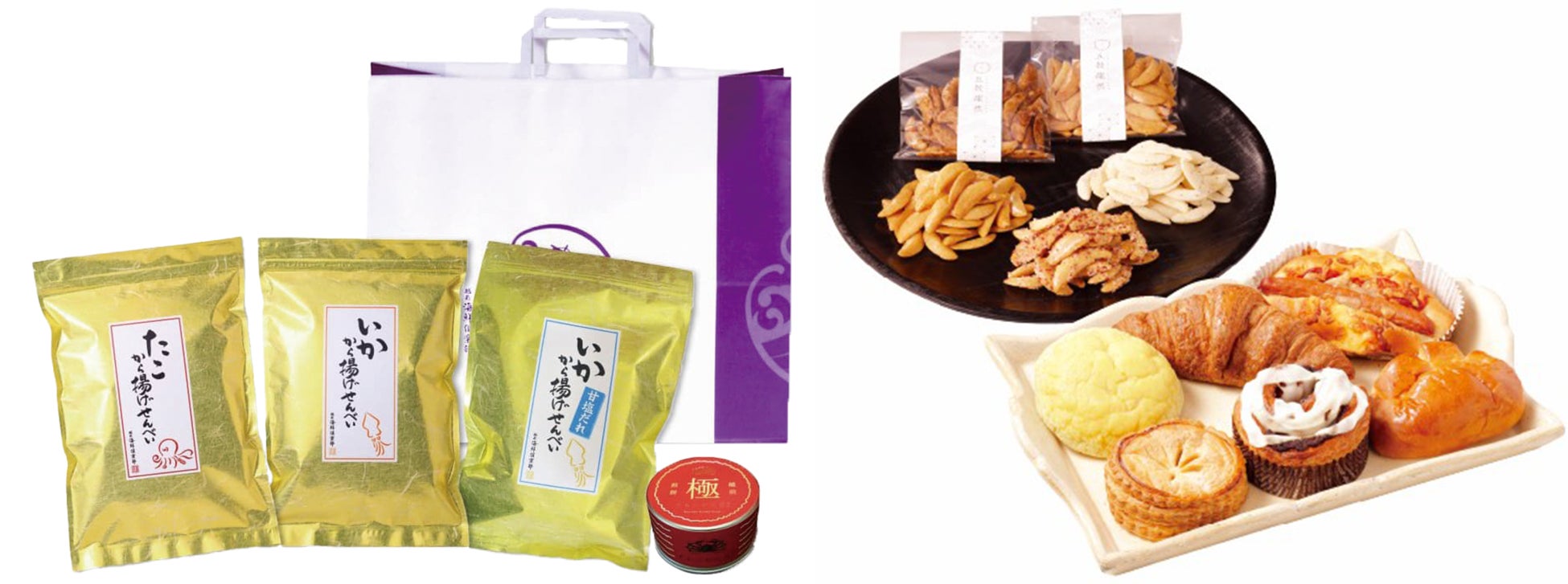 右:(左)大粒柿の種5袋セット ¥1,013 (右)菓子パン・惣菜パンの選べる6個セット ¥1,200 数量限定各日80