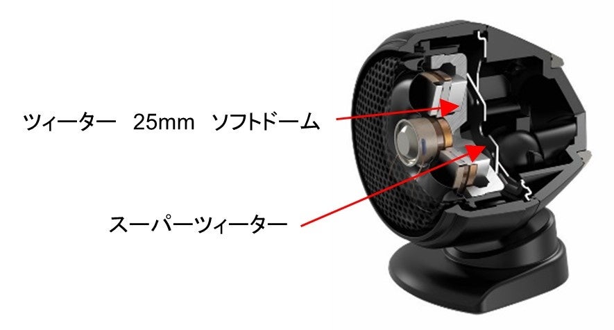 通常のツィーターに加え、スーパーツィーターを内蔵した「2Wayツィーター」は、振動板を素材から見直した「新25mmソフトドームツィーター」を採用した新設計により、自然なハイレゾ帯域に調整することで、ボーカル帯域までの再現性を拡大しています。