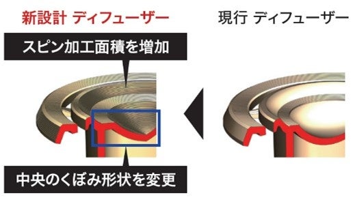 ウーファーのディフューザー部において中央のくぼみ形状を変更し、スピン加工面積を増加させた、新設計のディフューザーを採用。ボーカル帯域がより鮮明になり、臨場感も向上します。