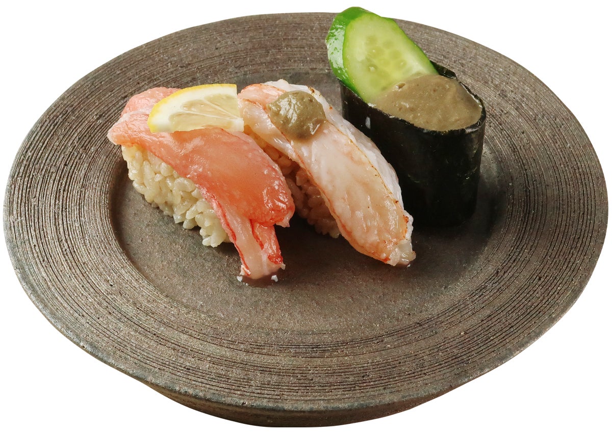そして、この時期に食べたい蟹の贅沢な寿司が登場します。「生ずわい蟹入り蟹づくし3貫」は、生ならではのとろっとした身質が特長の“生”のずわい蟹と、提供前にさっと炙り、蟹みそをトッピングした“炙り”、濃厚さがこだわりの“蟹味噌軍艦”を一皿でお楽しみいただけます。蟹味噌は、味や食感に奥行きを出すため、蟹身をブレンドしており、濃厚で味わい深く、お酒のツマミとしてもよく合います。