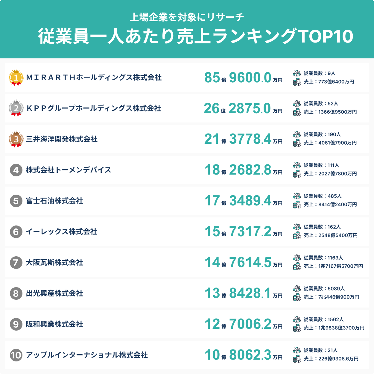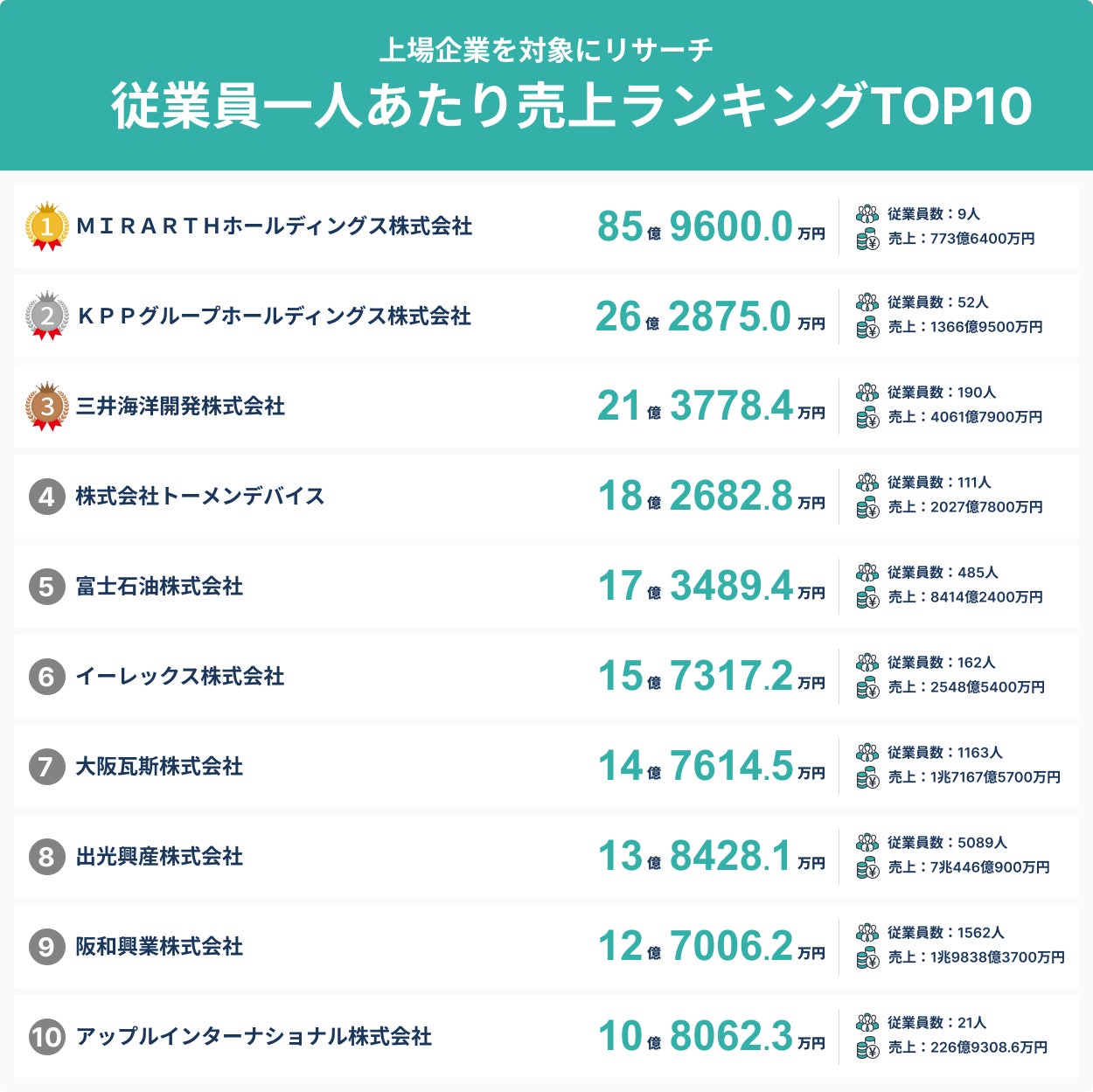 第1位は85億円超え!?従業員一人あたり売上ランキングTOP10!/SalesNow DBレポート