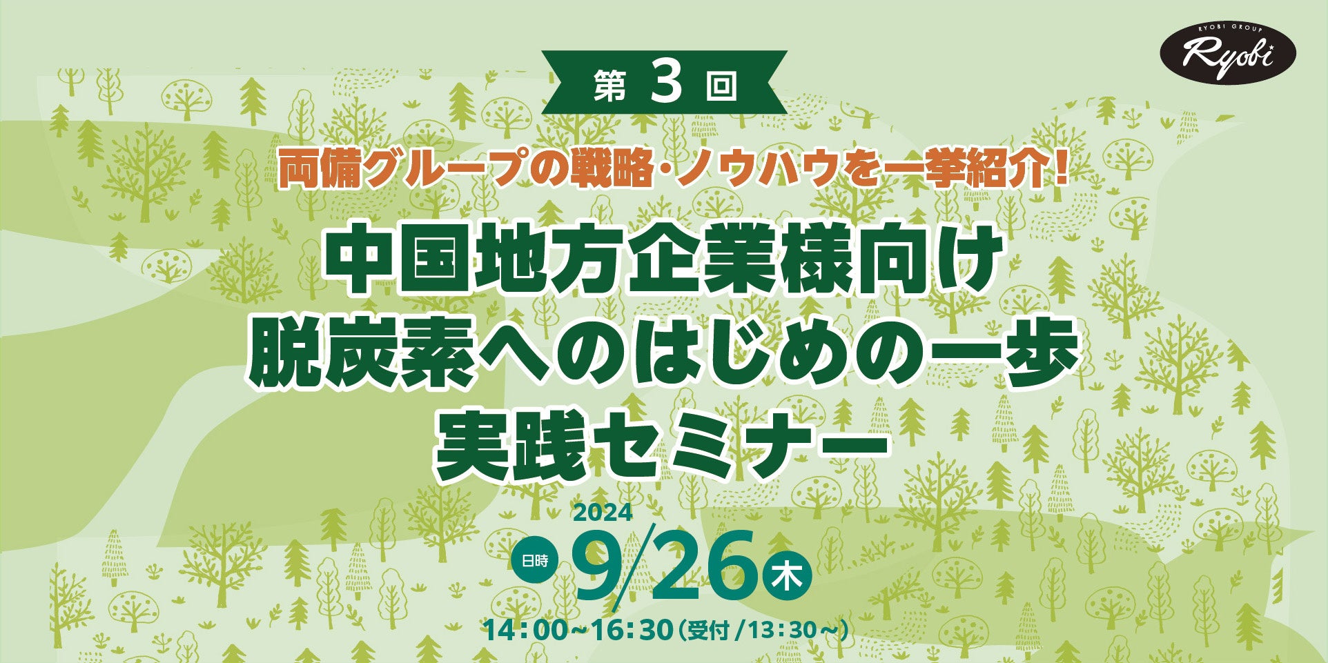 この度、 3回目となる「両備グループの戦略・ノウハウを一挙紹介!中国地方企業様向け脱炭素へのはじめの一歩実践セミナー」を、 2024年9月26日(木)中国地方の企業を対象に開催することになりました。 8月5日(月)より、セミナーにご参加いただける企業の募集を開始しましたのでお知らせいたします。