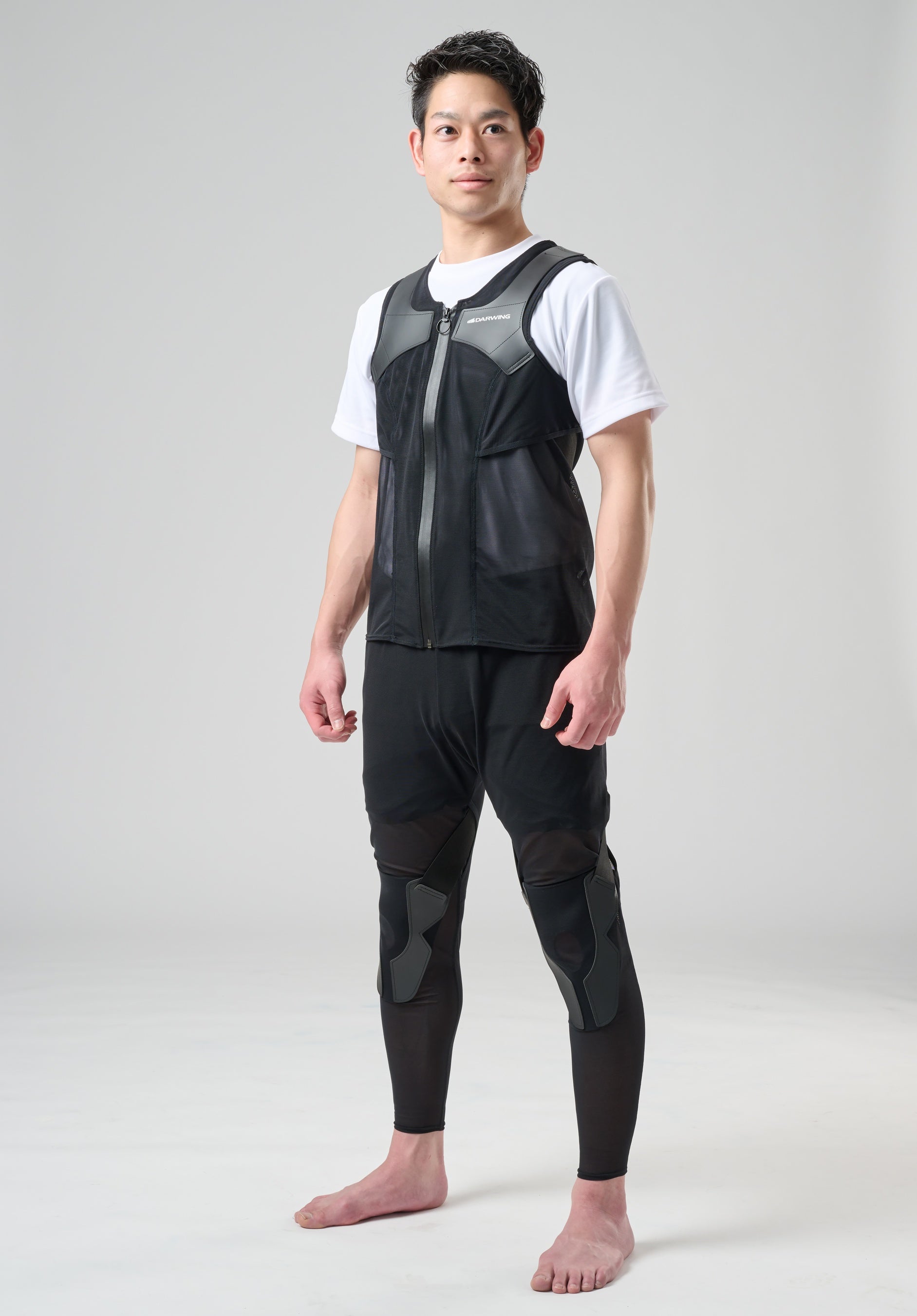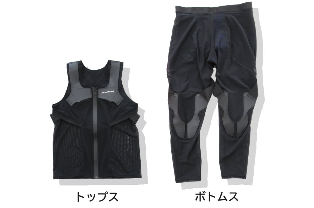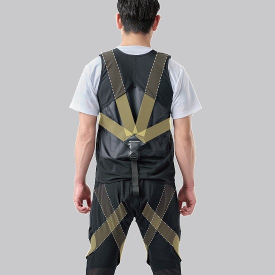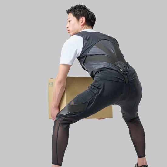 上下に分かれた形状で衣服を着るように簡単に装着できます。従来のアシストスーツ着用時の課題とされていた装着の難しさや、装着指導の困難さも解決されました。