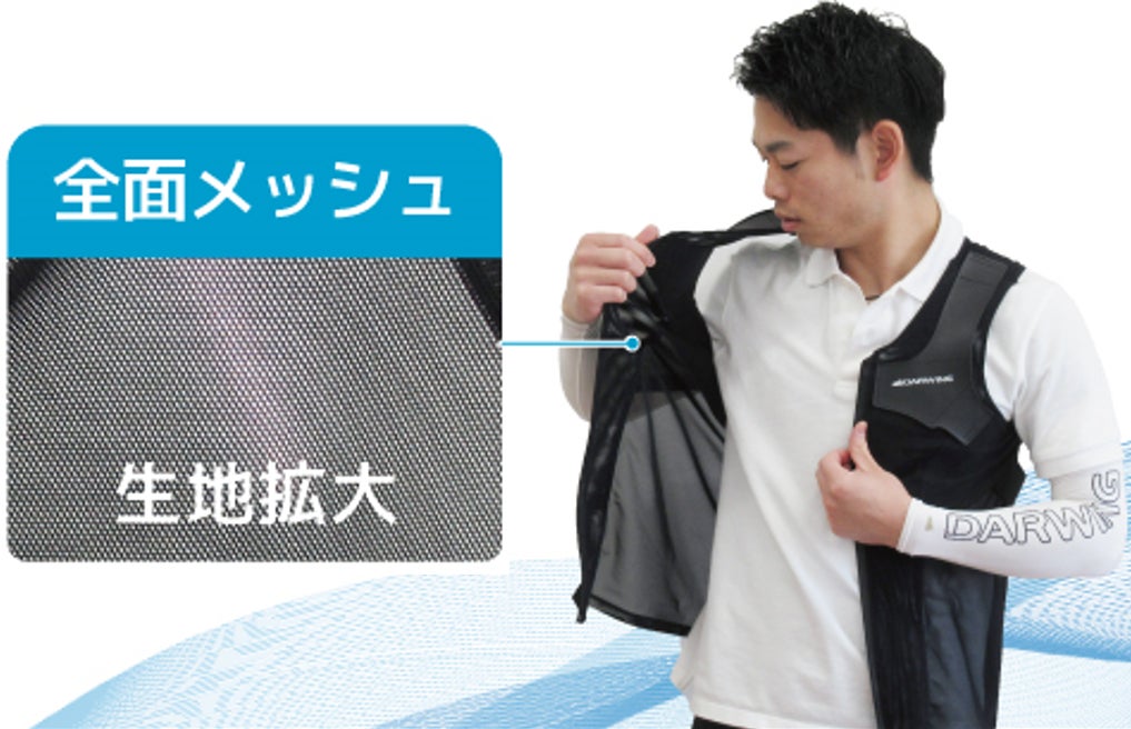 暑さ対策として、アシストスーツ全面にメッシュ生地を使用しました。通気性が良く、暑い夏でもムレにくいため、快適に作業できます。