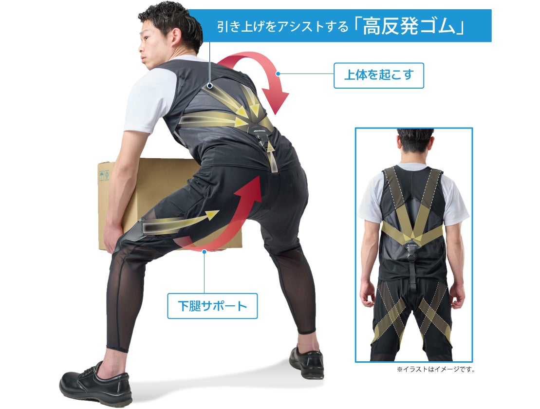 背中と太腿それぞれに配置した高反発ゴムの張力で上体を起こしながら腰周辺をサポートします。一般的なサポーターに使用されているゴムの約2倍※の張力がある高反発ゴムを背中から膝にかけて約6メートル使用しているため、力強いアシストを得ることができます。