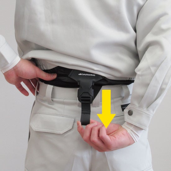 既定の作業着や制服等の関係で従来のアシストスーツの着用ができないという声を踏まえ、作業着の中へ着用できるように設計しました。サイズ調整やアシストのON/OFFの切り替えは、背中~腰部分にある調整ベルトとアタッチメントのみで完了するため、アシストスーツの上に作業着や制服を着たままで過ごせます。また、作業着の中への着用が可能になったことで、ハーネス等の装備とも併用できます。