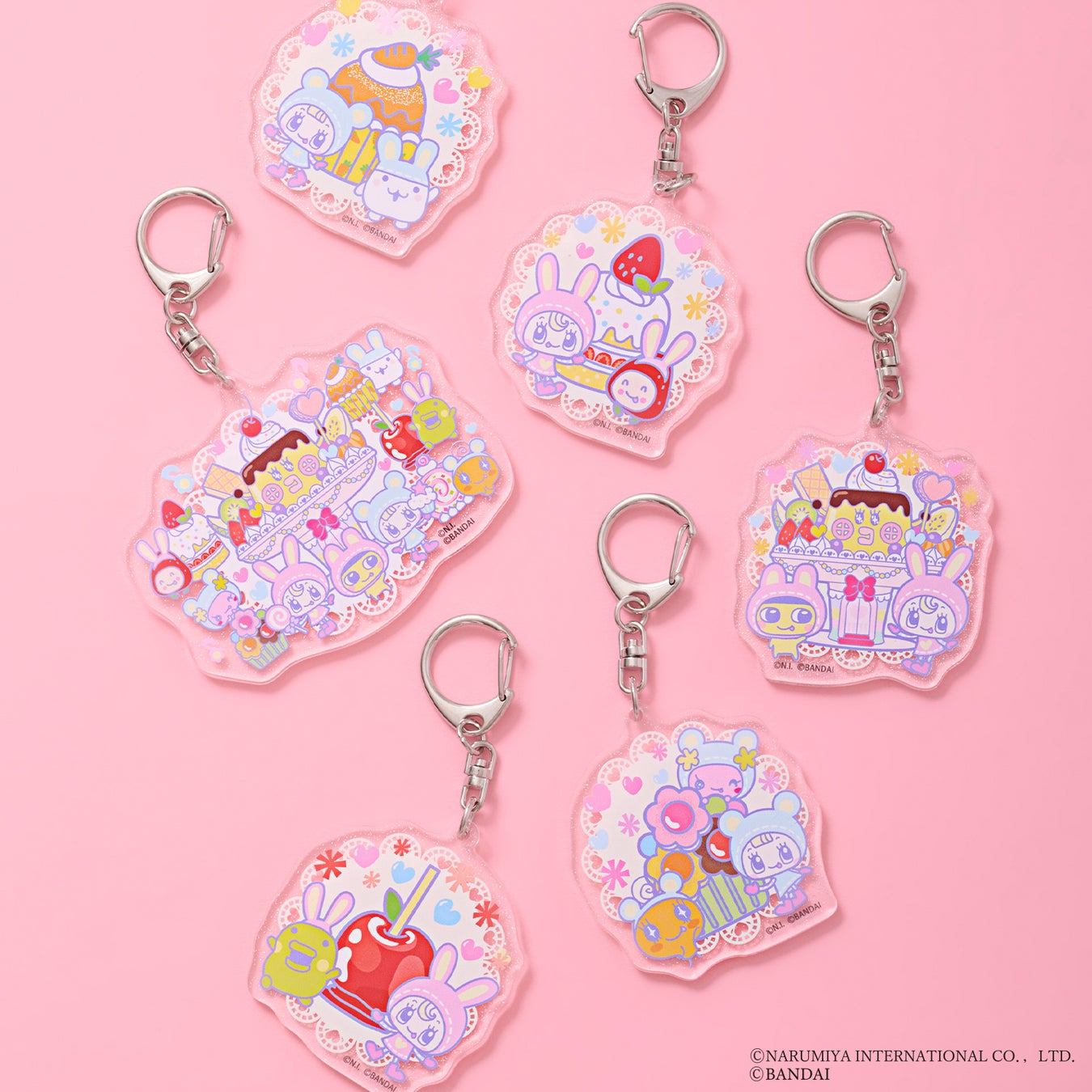 たまごっちのバースデーをお祝いしているような、メゾピアノのキャラクターたちとたまごっちたちのイラストがかわいいデザインです。オリジナルデザインのビニールストラップも付属!