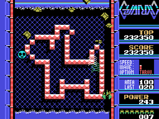 ゲームはトップビューを採用。プレイヤーは自機を操作して敵と戦い、一定数の敵を破壊すると次のステージへと進めます。ただし、その際にはルート選択や自機のパワー配分などもあり、他のシューティングでは味わえない戦略性が楽しめます。特にパワー配分は重要で、これはスピードやショットなどにパワーを振り分けるというものなのですが、ここ一番でパワー不足にならないよう、先を見越して節約をしておくなどの工夫が必要になります。