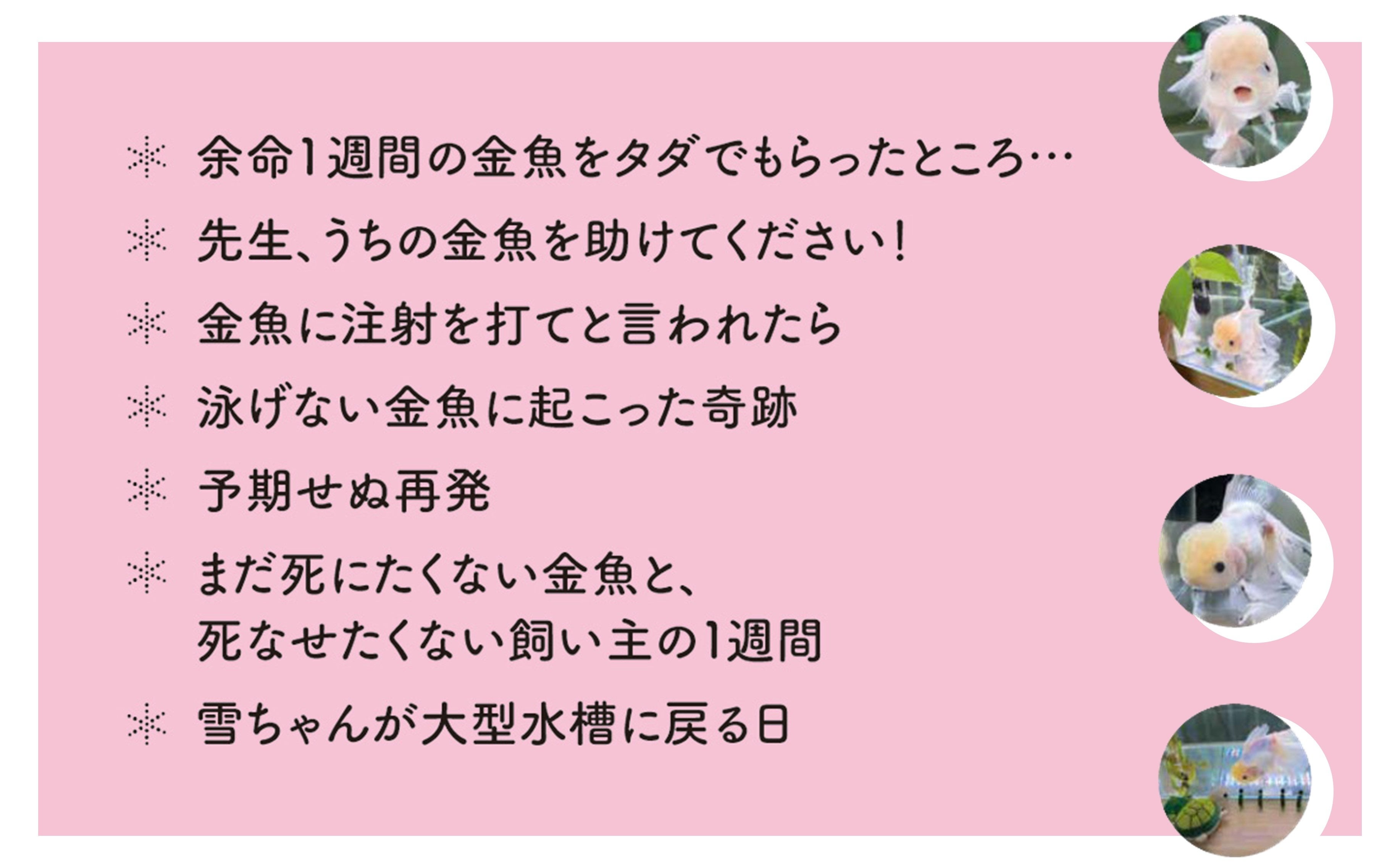 著者の勇気、助けたいと願う必死さ、それに応えて何度も病に打ち勝つ雪ちゃんに、金魚に興味がない人も、思わず引き込まれるドラマチックストーリー。大人気の金魚「雪ちゃん」が本になりました。