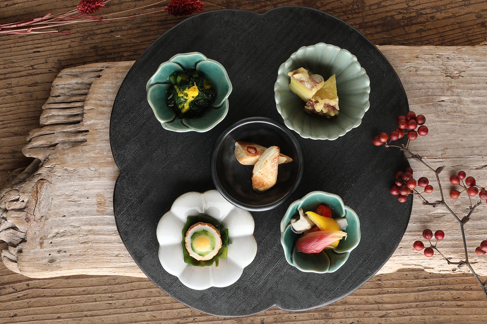 焼き芋天、土佐ベルガモット塩、春菊のおひたし、きのこと野菜のピクルス、マコモダケのきんぴら、ちくきゅう、海藻と黄味酢