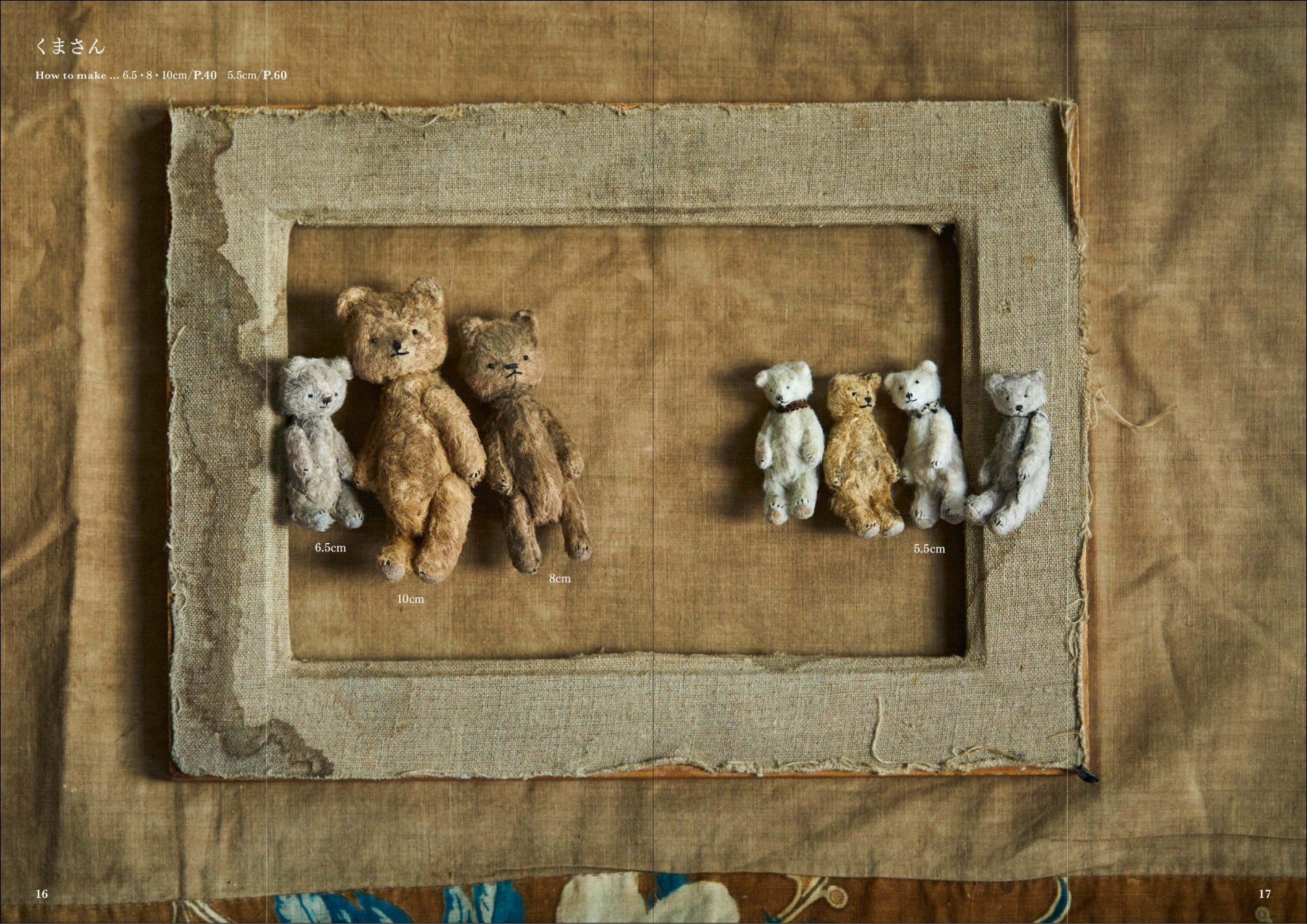 くまさん、ねこさん、うさぎさん、いぬさん、きつねさん、ぞうさん、りすさん、ひつじさん、ねずみさん…、森田寛子さんの作品の中でも人気の動物たちが満載の一冊です。ミニチュアぬいぐるみは手縫いで、そして小さな布で作れるところが魅力。ミニチュア好きはもちろん、可愛いものが大好きな女性も作ってみたくなるようなアンテークな風合いは思わず引き込まれること間違いなし!
