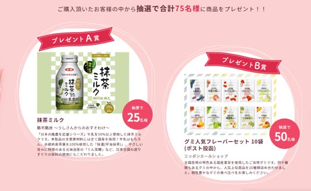 また、対象の母の日商品をご購入いただいた方の中から抽選で75名様に、「抹茶ミルク」や「グミ人気フレーバーセット」など、豪華商品が当たるキャンペーンを行います。