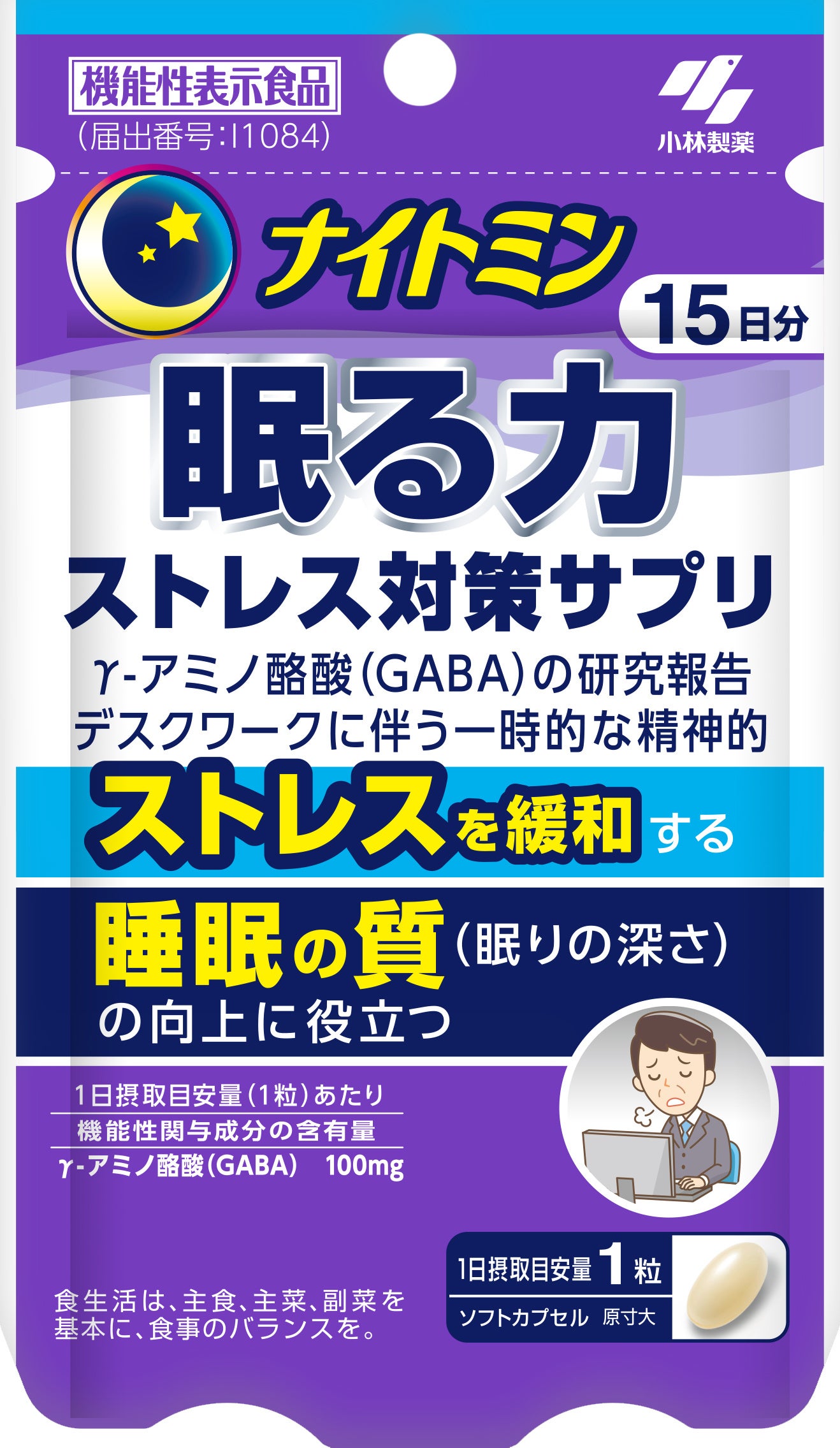 小林製薬株式会社(本社:大阪市、社長:豊田 賀一)は、快適な睡眠をサポートする『ナイトミン眠る力』ブランドより、γ-アミノ酪酸(GABA)が一時的なストレス*¹を緩和し、睡眠の質(眠りの深さ)の向上に役立つことに着目した機能性表示食品「ナイトミン 眠る力 ストレス対策サプリ」を2026年4月1日(水)より全国にて発売します。