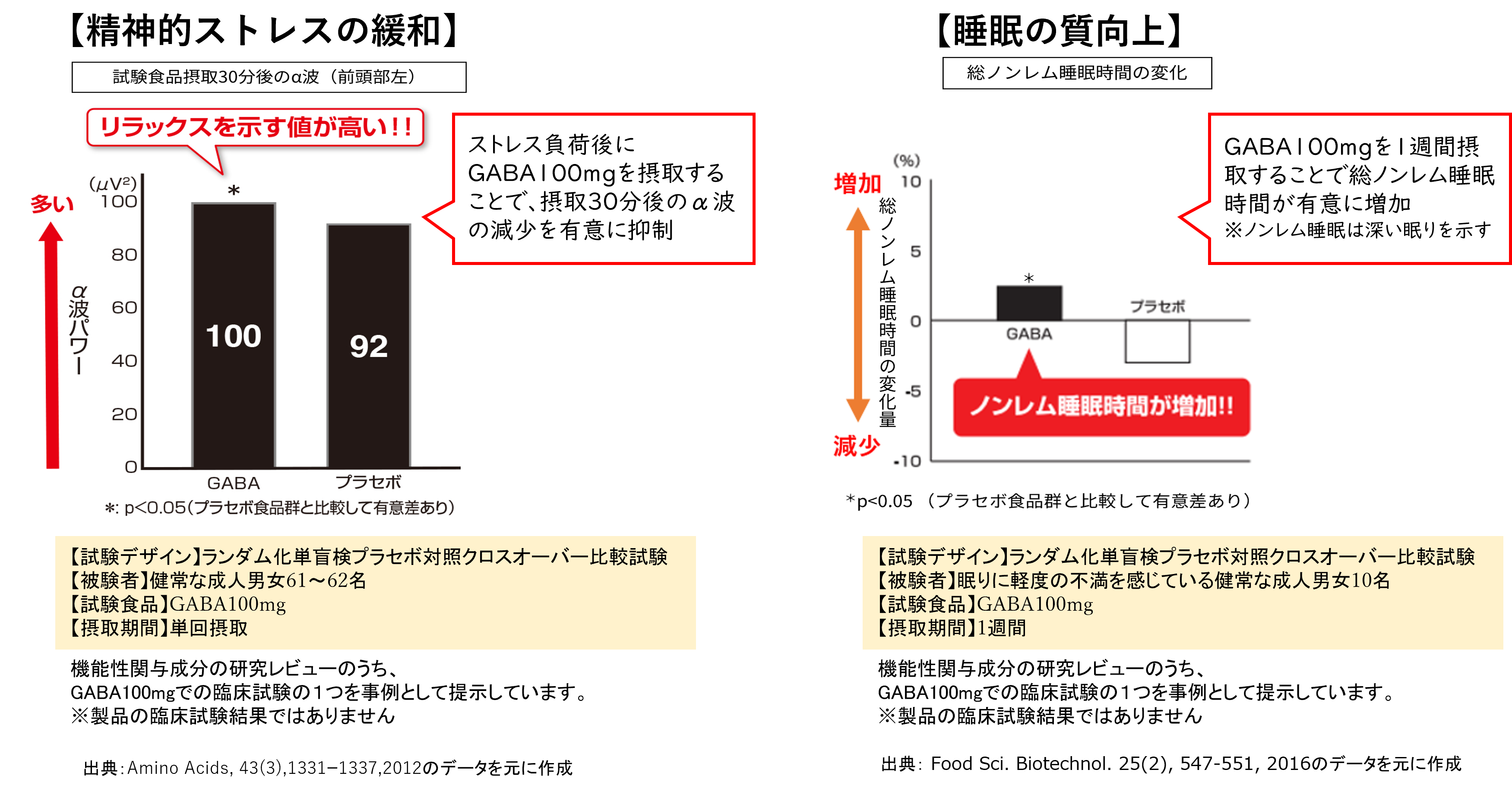 ■機能性関与成分GABAが一時的なストレス*¹を緩和&睡眠の質の向上に役立つ(GABAの研究報告)