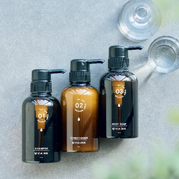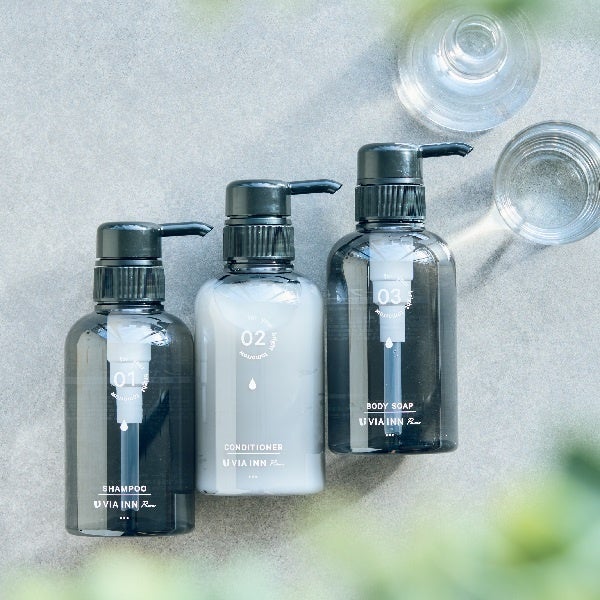 ヴィアインオリジナルインバスは、SDGsコンセプトの天然由来保湿成分を配合した、地球にも身体にも優しい製品です。出張や旅行で訪れたお客様が、その日の緊張や疲れを洗い流し、気持ちよく「明日」を迎えていただくことを願い、澁谷油脂株式会社と共同で開発した安全安心のメイドインジャパン品質です。