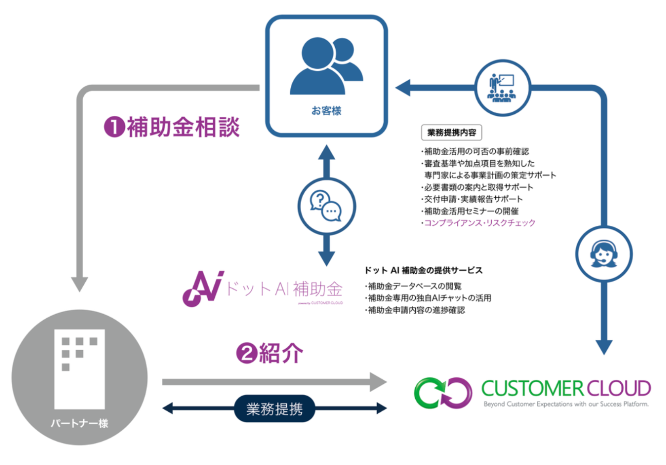 パートナー企業がお客様から補助金申請に関するご相談を承った際、お客様の同意を得てカスタマークラウドの専門家による申請支援サービスをご紹介いたします。