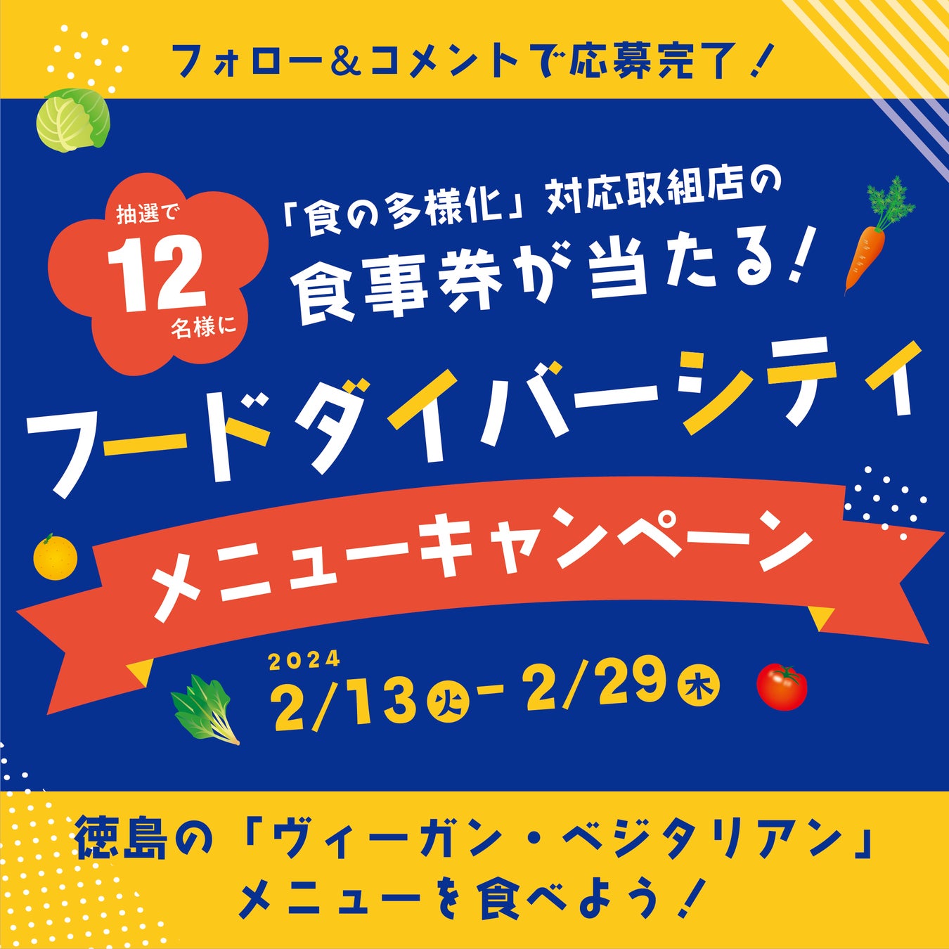 阿波ふうどダイバーシティ公式Instagram(@awafood.fooddiversity)をフォローし、キャンペーン告知投稿に「キャンペーン応募」とコメントした方の中から、抽選で12名にキャンペーン参加店舗で使える『食事券』(1,300円相当)をプレゼントします。
