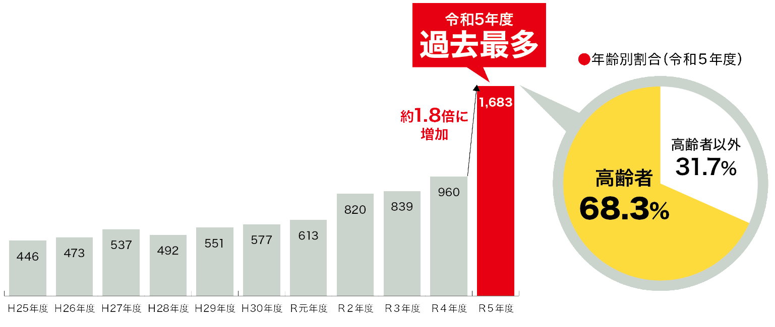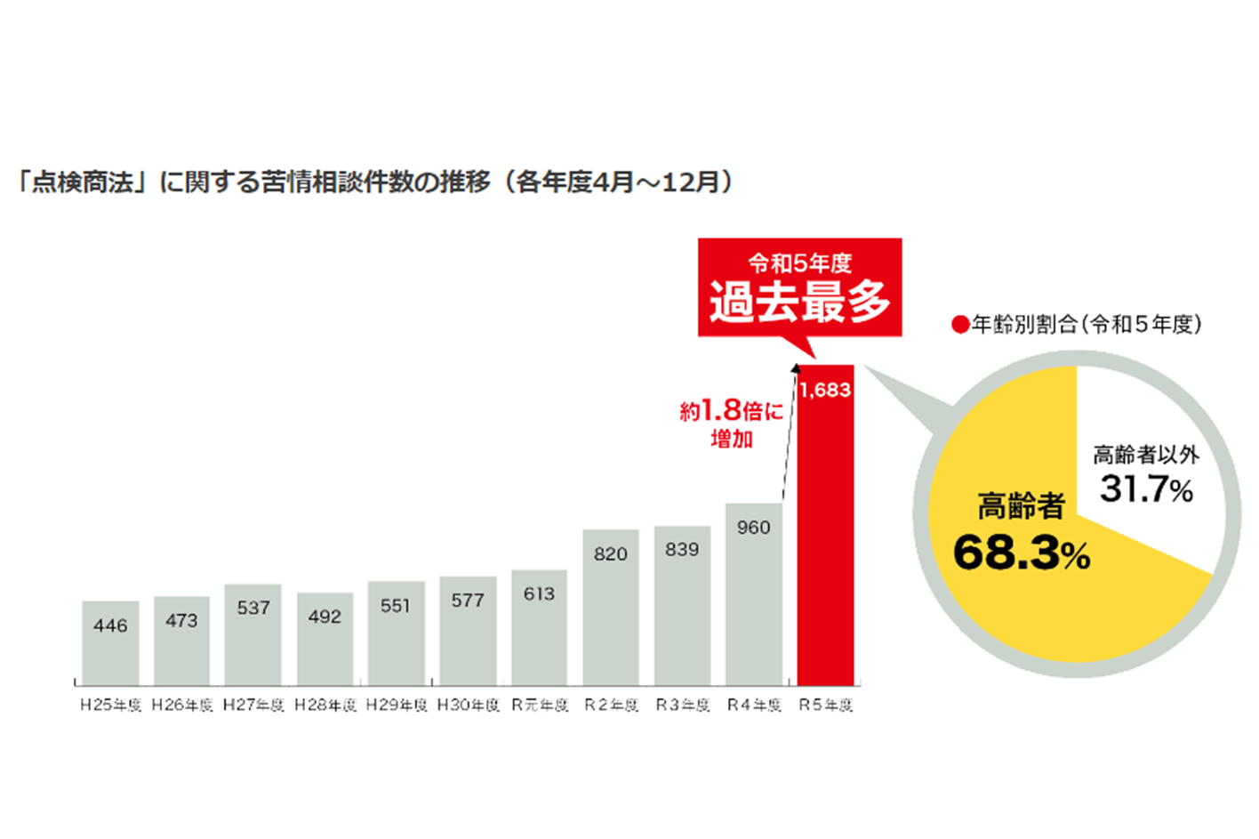 令和5年4月~12月の間に、県内の消費生活相談窓口に寄せられた「点検商法」に関する苦情相談件数は1,683件で、前年同期(960件)と比べ約1.8倍に増加し、過去最多(注記)となっています。