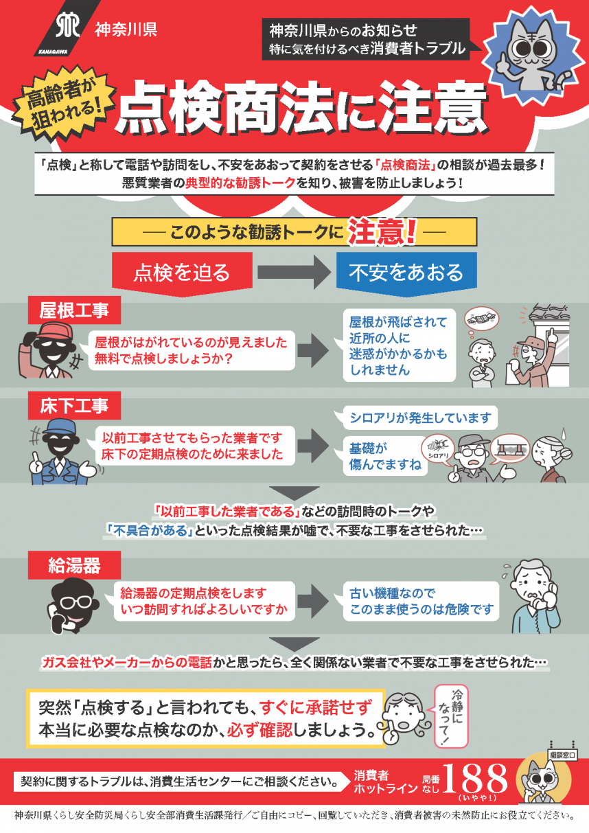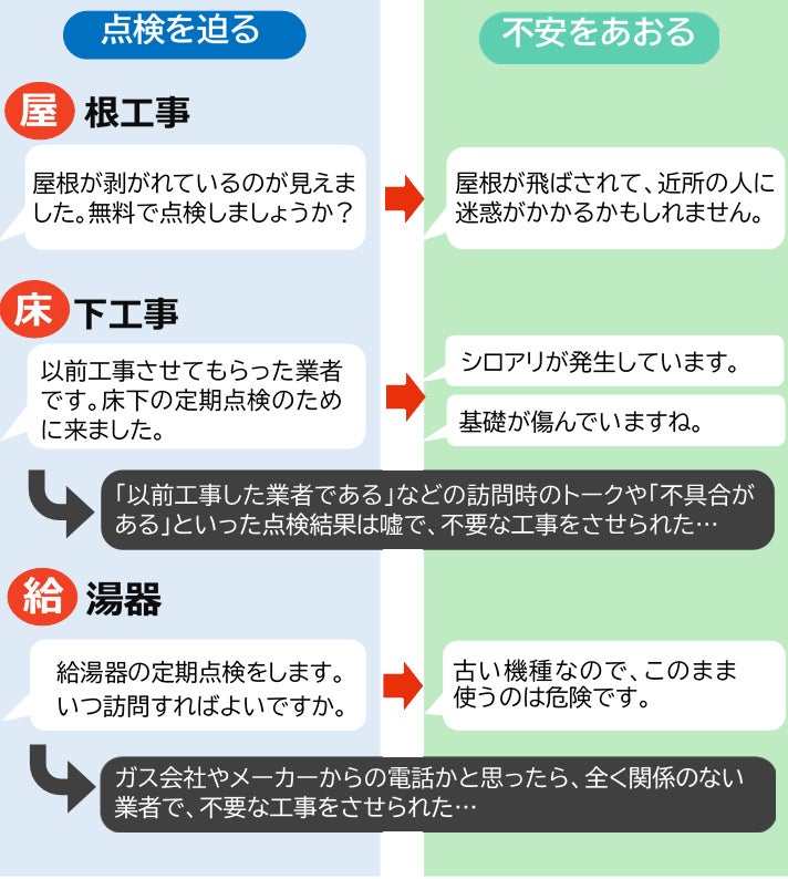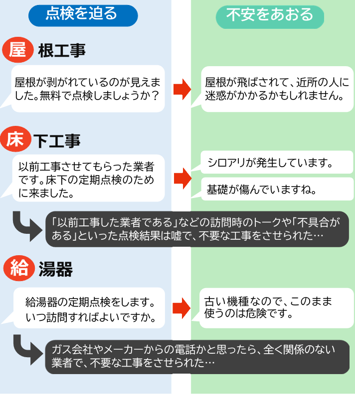 点検商法とは、「点検」と称して、電話や訪問をして「工事が必要」「修理をしないと危険」などと言って、不安をあおり契約させる商法です。