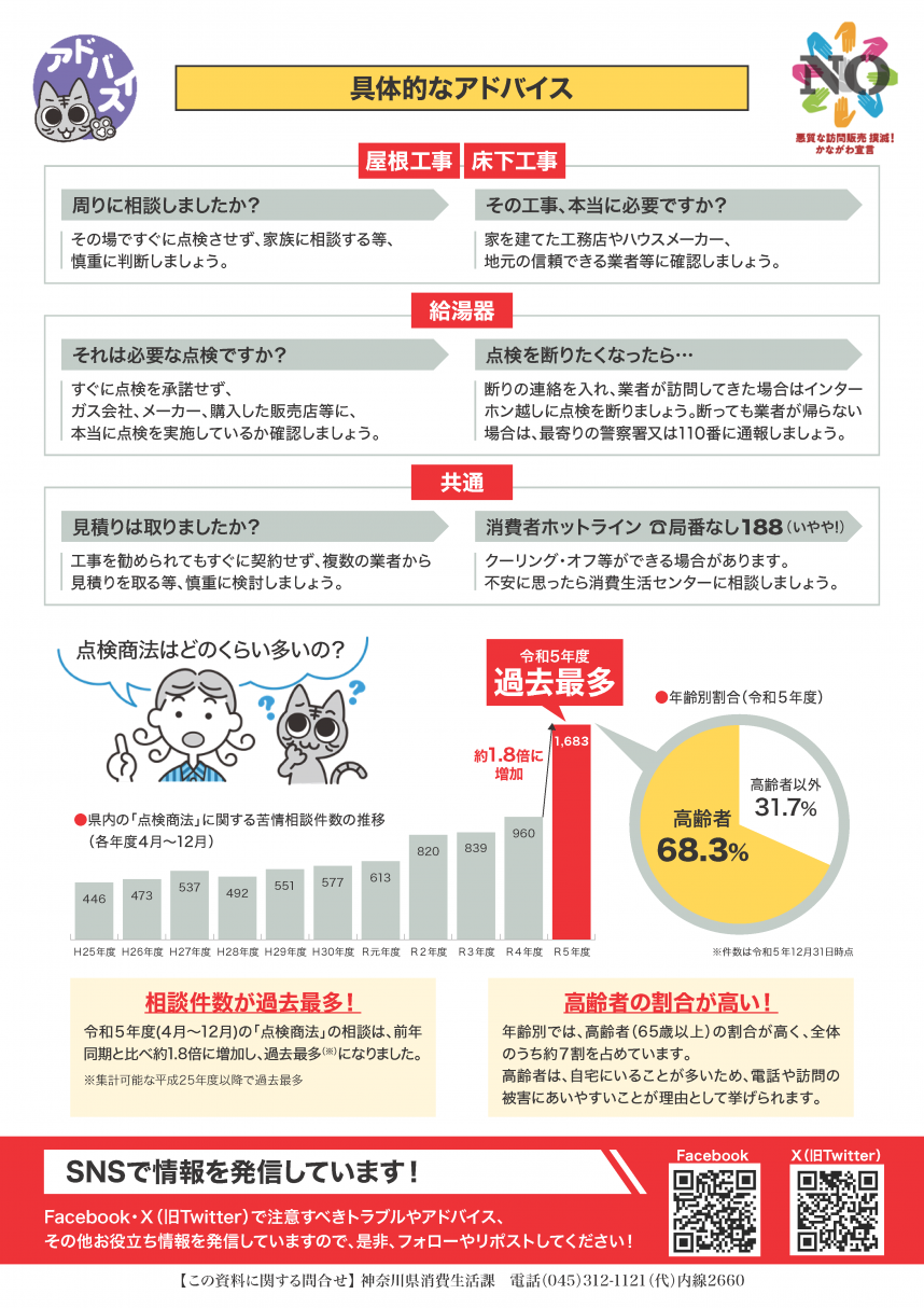 特に屋根や床下の工事、給湯器の交換に関する点検商法の相談が多い状況です。