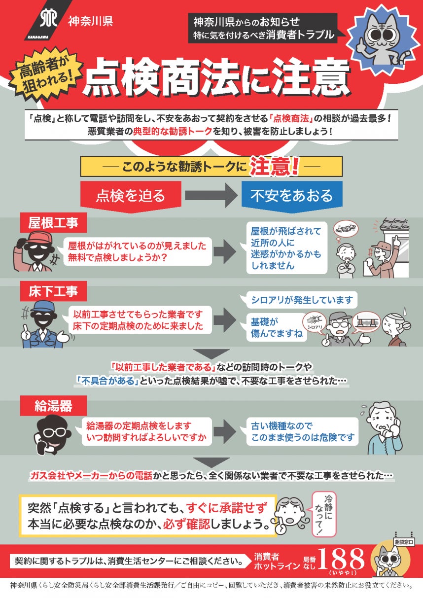 屋根や床下、給湯器などの点検をすると言って訪問し、点検結果が悪いなどと消費者の不安をあおり契約させる点検商法のトラブルについて情報提供した。今回の契約は訪問販売に当たるため、クーリング・オフ通知を出してもらい、センターでも業者に連絡し、契約が解除されていることを確認できた。今後は、複数の業者から見積りを取って慎重に判断するよう助言した。