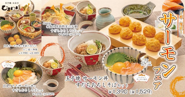 秋のサーモンに名物玉子焼(明石焼)、すだちの香りと酸味が食欲をそそるすだちおろしそば、サーモン丼には卵黄をトッピングし、特製海鮮醤油でお召し上がりください。