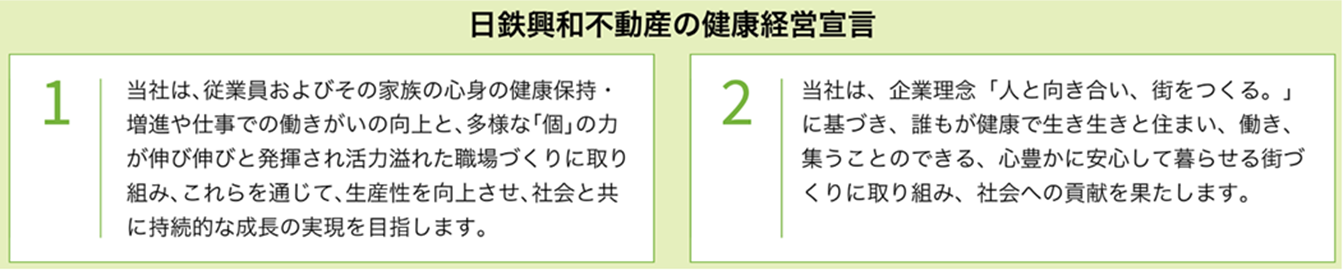 当社は、『日鉄興和不動産の健康経営宣言』を定め、以下の考え方で健康経営に取り組んでいます。