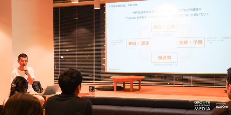 第一部では、株式会社LIFULL プロダクトマネージャーの井上洸太朗氏と、DearOneの麻野による対談形式で、Amplitudeを活用し、「市場学習回数」を重要な指標と位置づけ、仮説検証のスピードと施策の成果向上を両立させた取り組みが紹介されました。