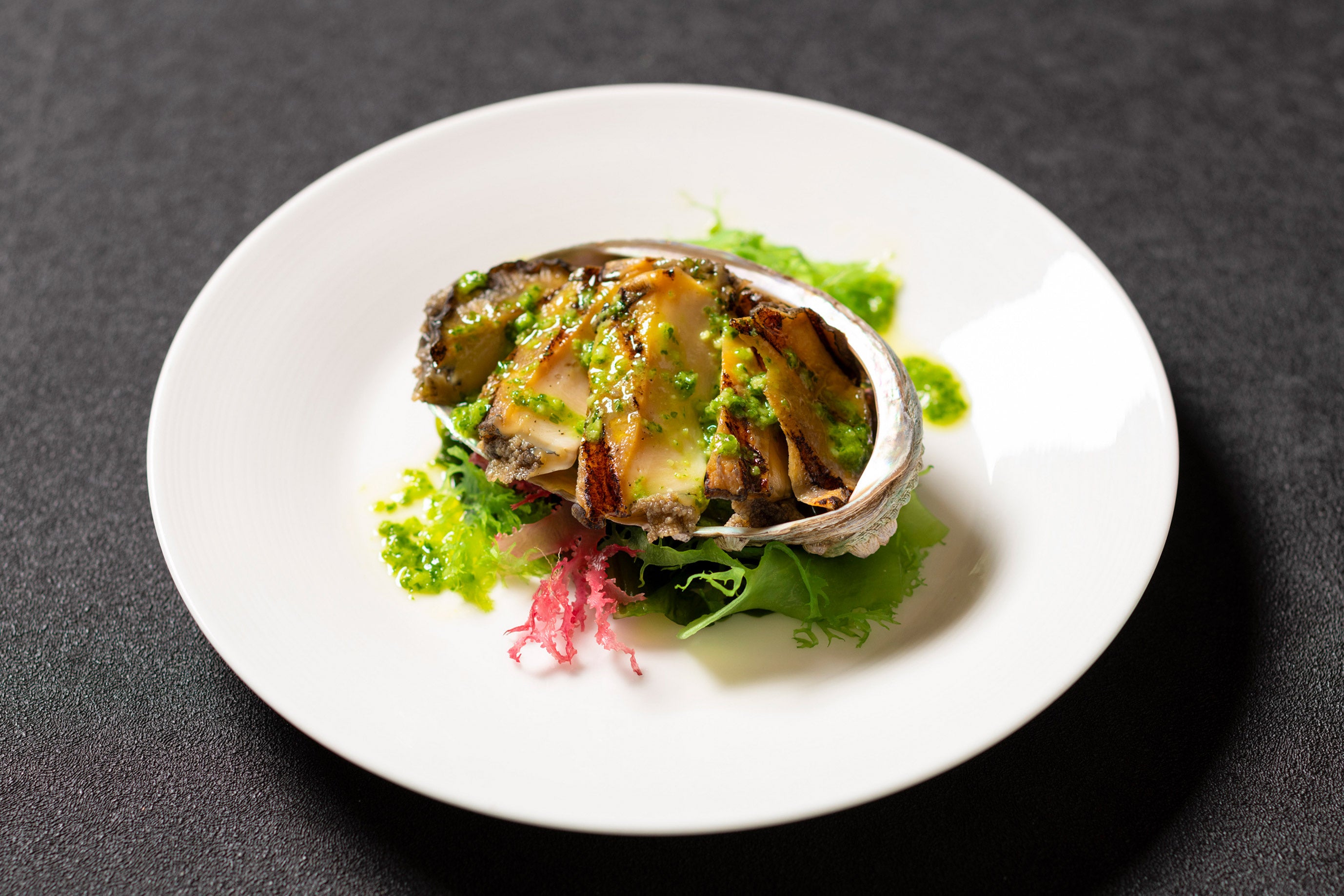 ・鮑柔煮ステーキ 春菊ソース