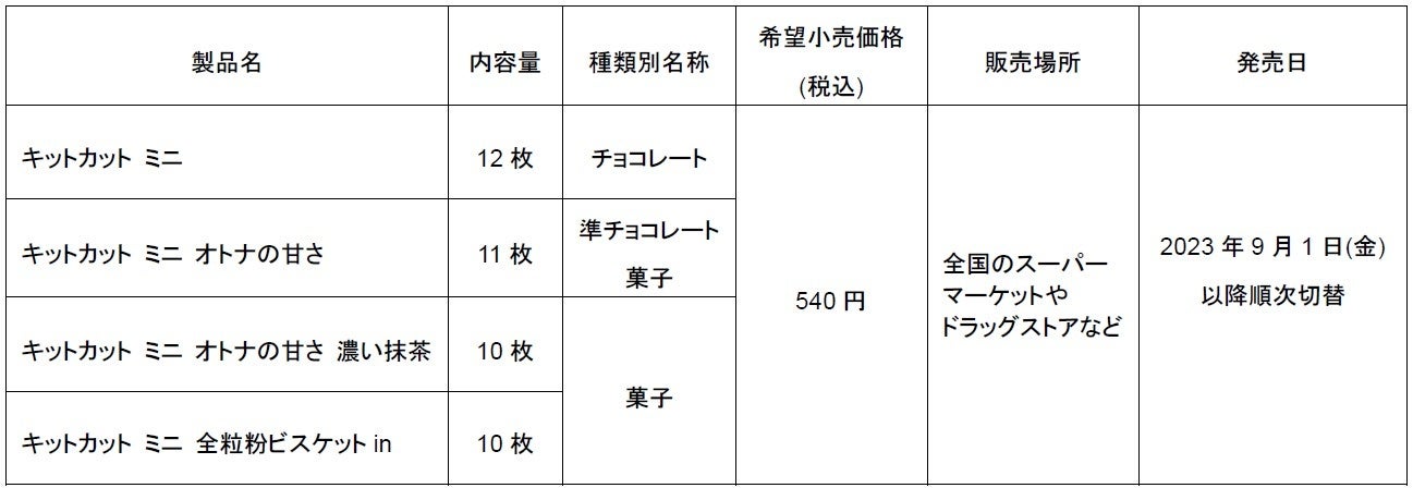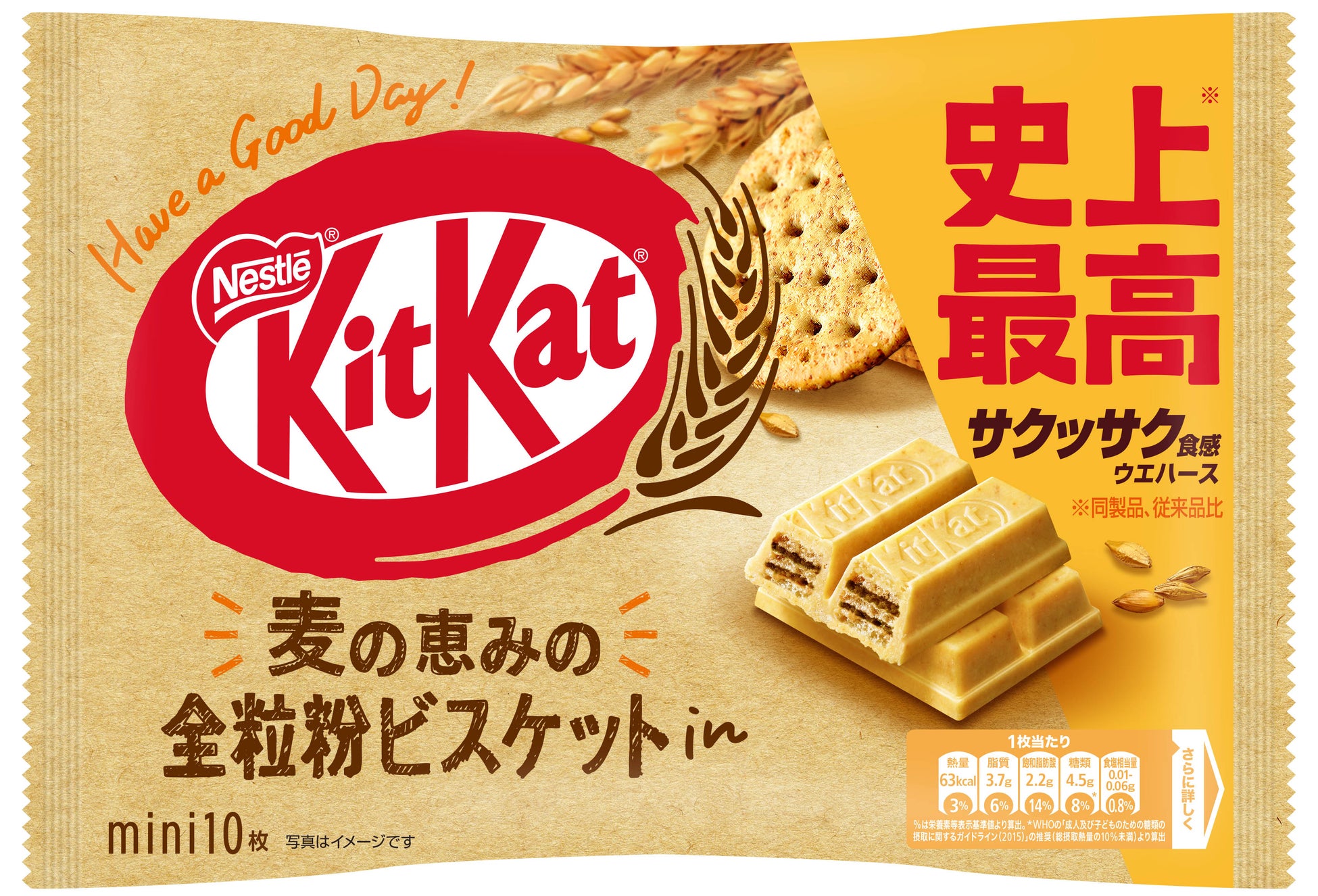 なお、「キットカット ミニ」だけではなく、その他の主力3製品「キットカット ミニ オトナの甘さ」、「キットカット ミニ オトナの甘さ 濃い抹茶」、「キットカット ミニ 全粒粉ビスケットin」においてもウエハースを同様に改良し、サクッサク食感に仕上げています。
