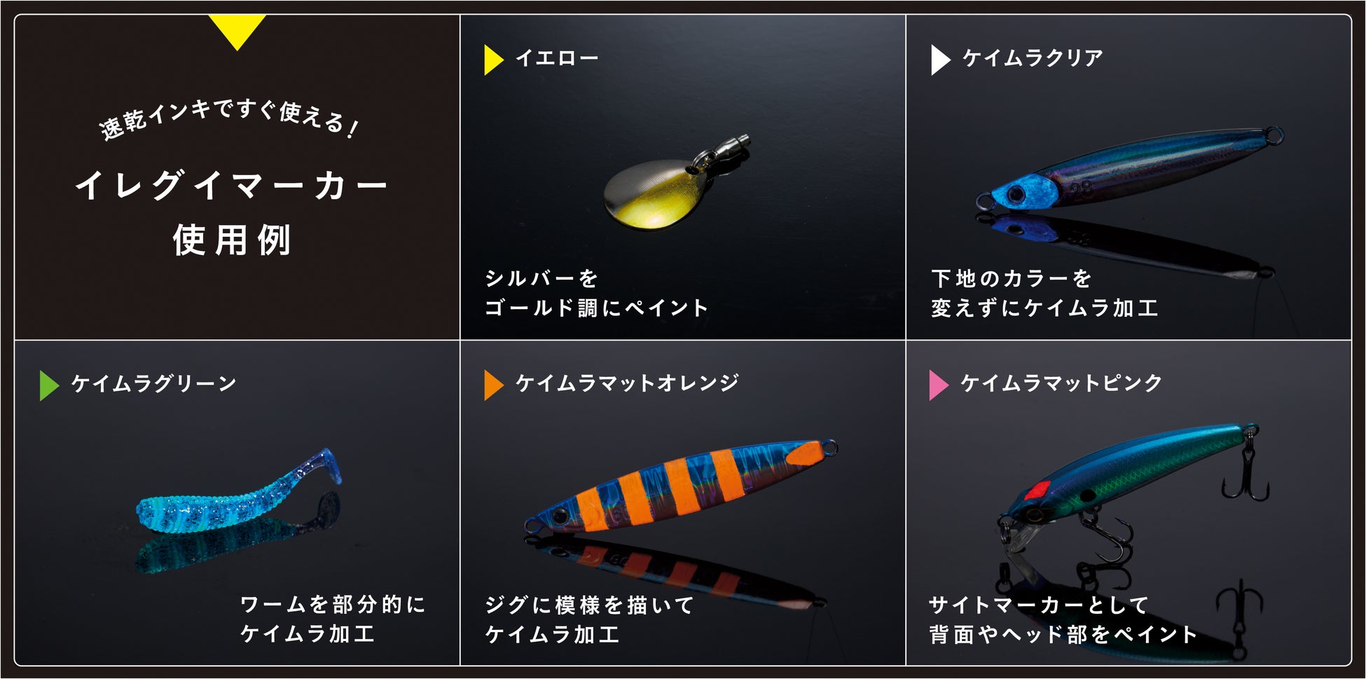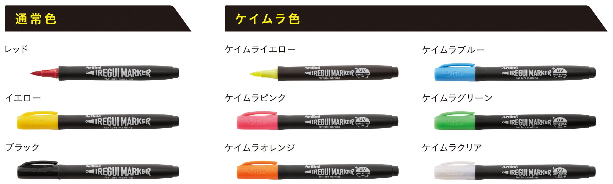 この度発売する「イレグイマーカー ケイムラマット色」は、隠蔽性の高い油性インキを採用し、耐水性・速乾性に優れたマットカラーのマーカーです。カラーバリエーションは全4色。下地を隠したハイアピールカラーが表現できるので、魚の種類、その日の状況やお好みに合わせて手軽に色替えが可能で、さまざまな用途に合わせて使い分けることができます。