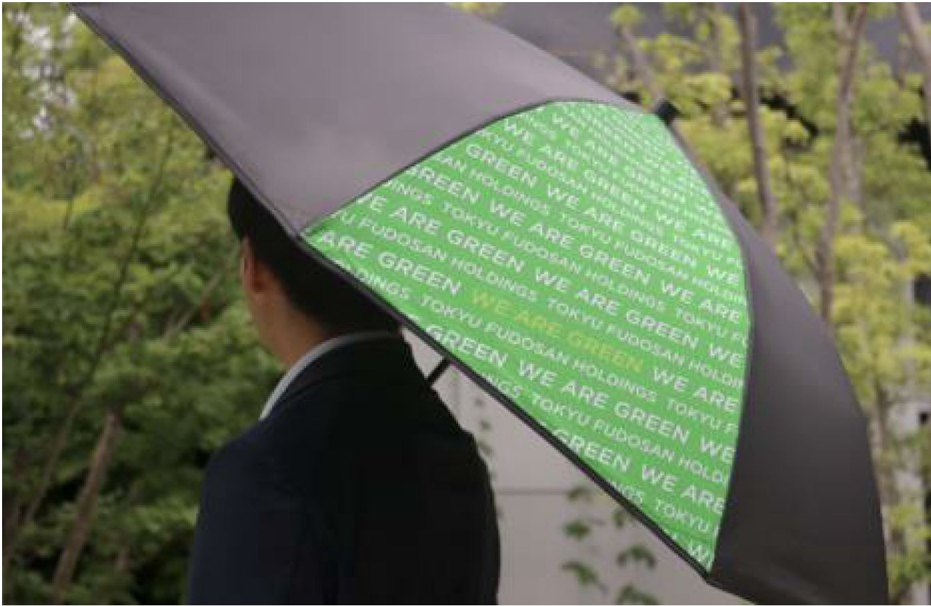 今回、2種類のオリジナルデザインの傘をつくりました。当社のスローガンである“WE ARE GREEN” の緑がアクセントの晴雨兼用傘と、鳥や蝶が飛び交う渋谷のエコロジカルネットワークをイメージした透明傘です。雨の日や猛暑の日にも、快適に渋谷の街を楽しんで頂けることを願っています。