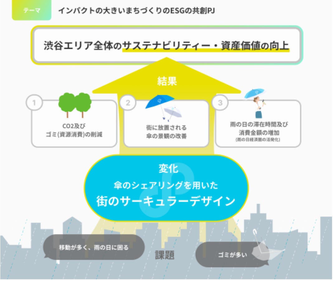 ①今年6月に「傘のいらない街 渋谷」を始動。渋谷区の環境保全と雨の日経済圏の活性化へ。