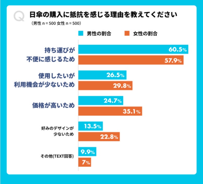 また、弊社が先月7月に実施した【夏の日傘需要】に関する調査(※3)では、男性の2人に1人が、熱中症対策で「日傘を利用したい」と回答した一方で、「持ち運びの不便さ」「普段の使用機会の少なさ」「価格の高さ」などの理由から、日傘の「購入への抵抗感」は、女性の約4倍(44.6%)であることが明らかとなりました。