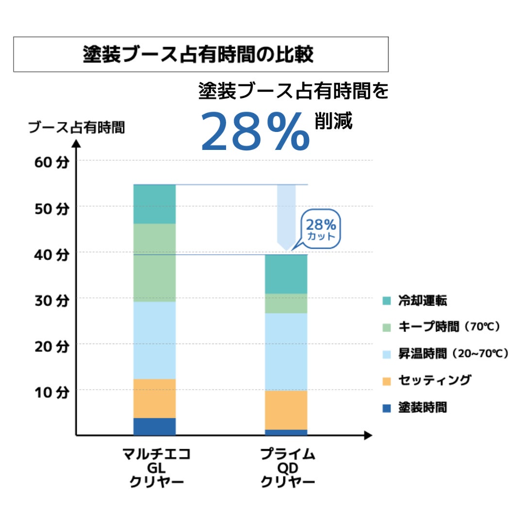 ① 速硬化性による作業効率化:塗装後からポリッシュまでに必要な強制乾燥時間の大幅短縮(最短40℃×10分※)により、塗装ブースでの滞留時間削減が可能です。従来品と比較し、塗装ブース占有時間を28%削減可能です。
