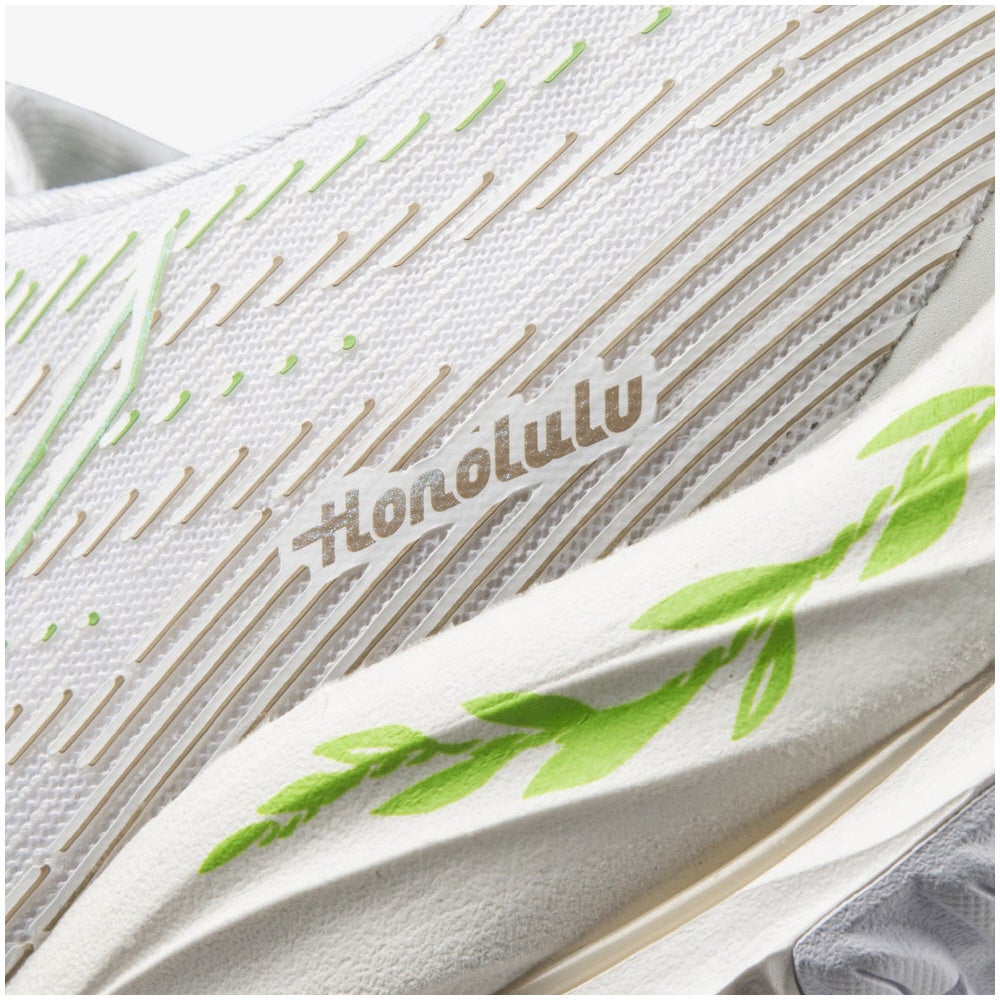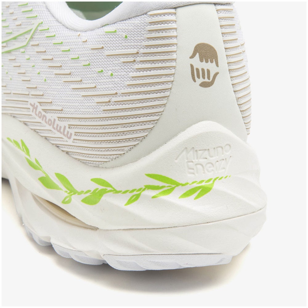 「WAVE RIDER 26」では、ホノルルをモチーフとしたカラーも発売します。カラーは、オフホワイトをベースにゴールドとグリーンをさし色にしながら、踵とベロ部にはレイをほどこしています。インソールも特別仕様です。