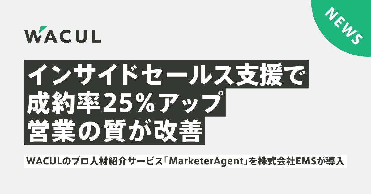 フリーランスによるインサイドセールス支援で成約率25%アップ&営業の質も改善!WACULのプロ人材紹介サービス「MarketerAgent」、クラウドシステムを提供する株式会社EMSの売上増に貢献