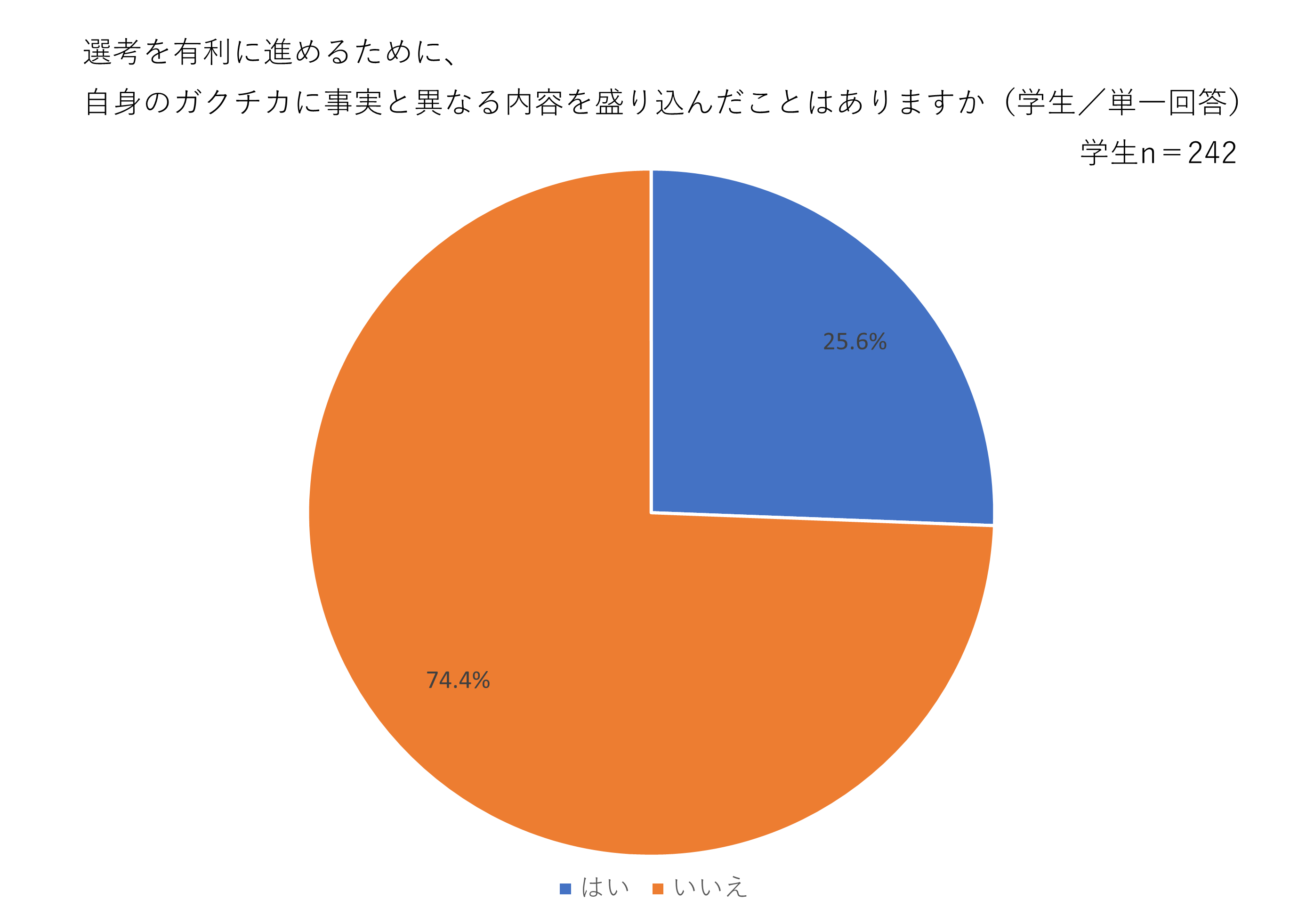 - 4人に1人(25.6%)が、選考を有利にするために自身のガクチカに事実と異なる内容を盛り込んだことがある