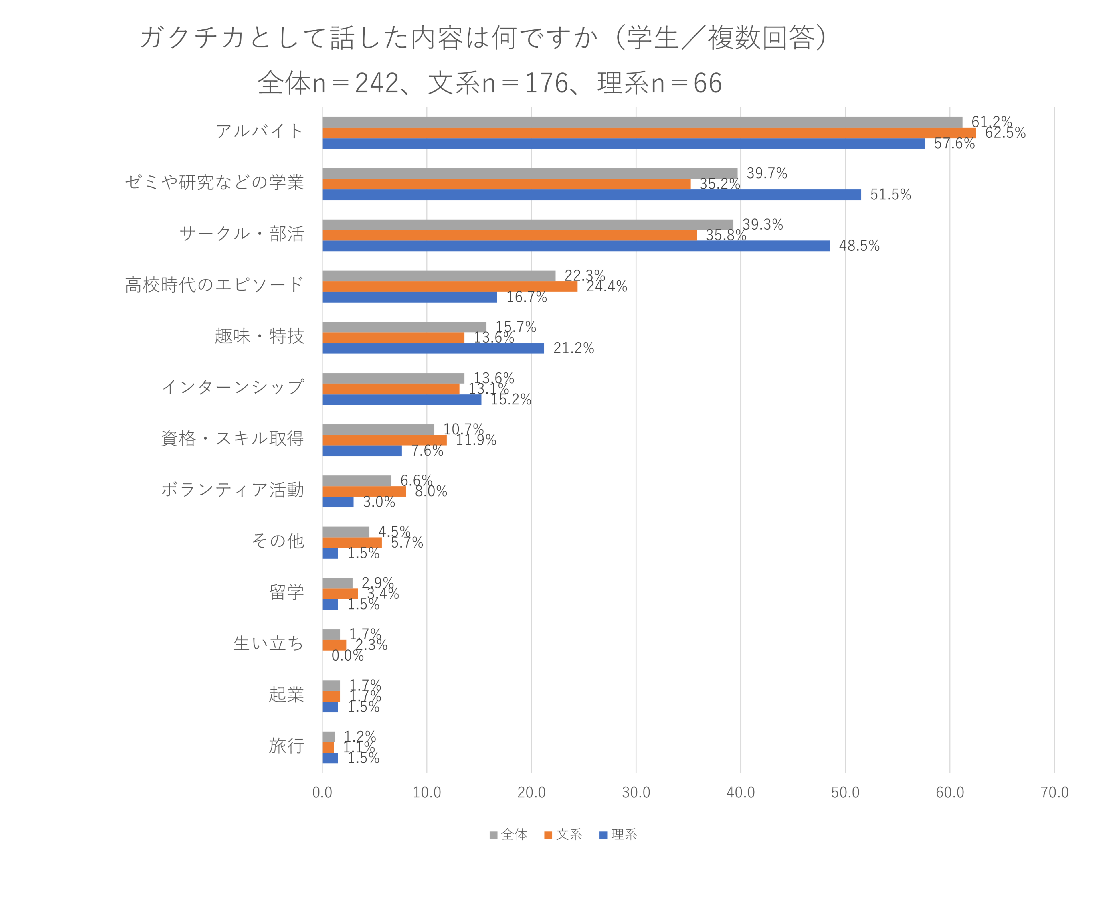 ③選考過程で実際にガクチカとして話した内容トップ3は、1位:アルバイト(61.2%)、2位:ゼミや研究などの学業(39.7%)、3位:サークル・部活(39.3%)となりました。文理別に見ると、文系では、1位:アルバイト(62.5%)、2位:サークル・部活(35.8%)、3位:ゼミや研究などの学業(35.2%)に対し、理系では、1位:アルバイト(57.6%)、2位:ゼミや研究などの学業(51.5%)、3位:サークル・部活(48.5%)となりました。