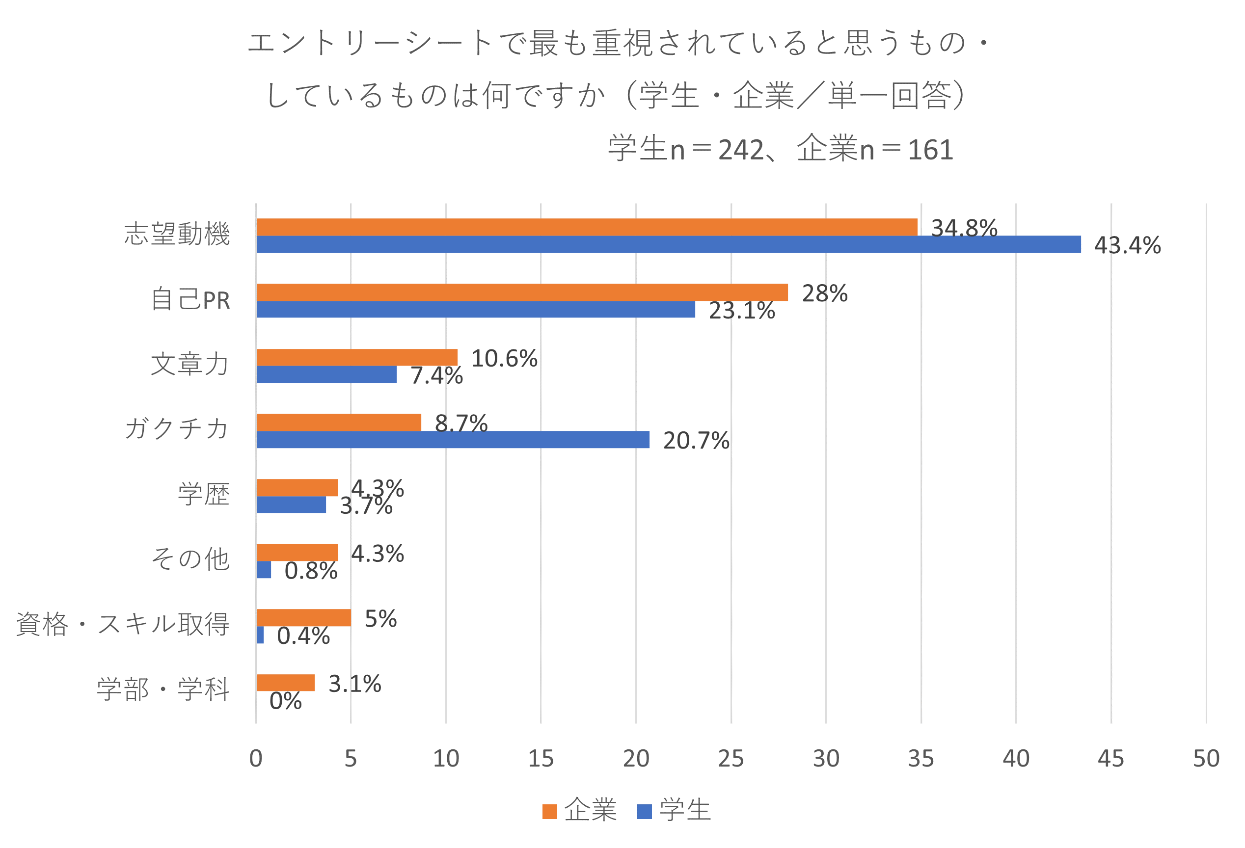 - エントリーシートで企業が最も重視していると思うのは、1位:志望動機(43.4%)、2位:自己PR(23.1%)、3位:ガクチカ(20.7%)