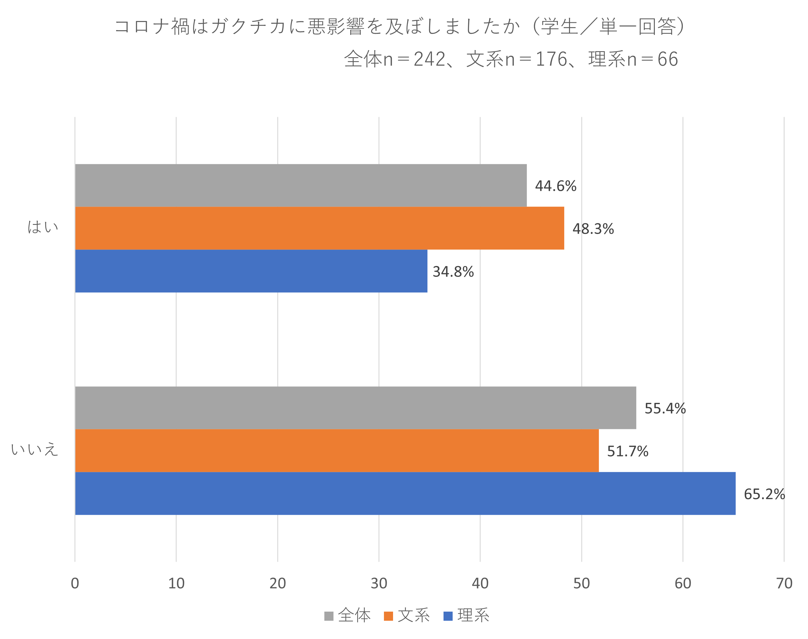 ②約4割(44.6%)の学生は、「コロナ禍がガクチカに悪影響を及ぼした」と回答しており、文理別に見ると、文系は約5割(48.3%)、理系は約3割(34.8%)となり、文理で13.5Ptの差が出ました。