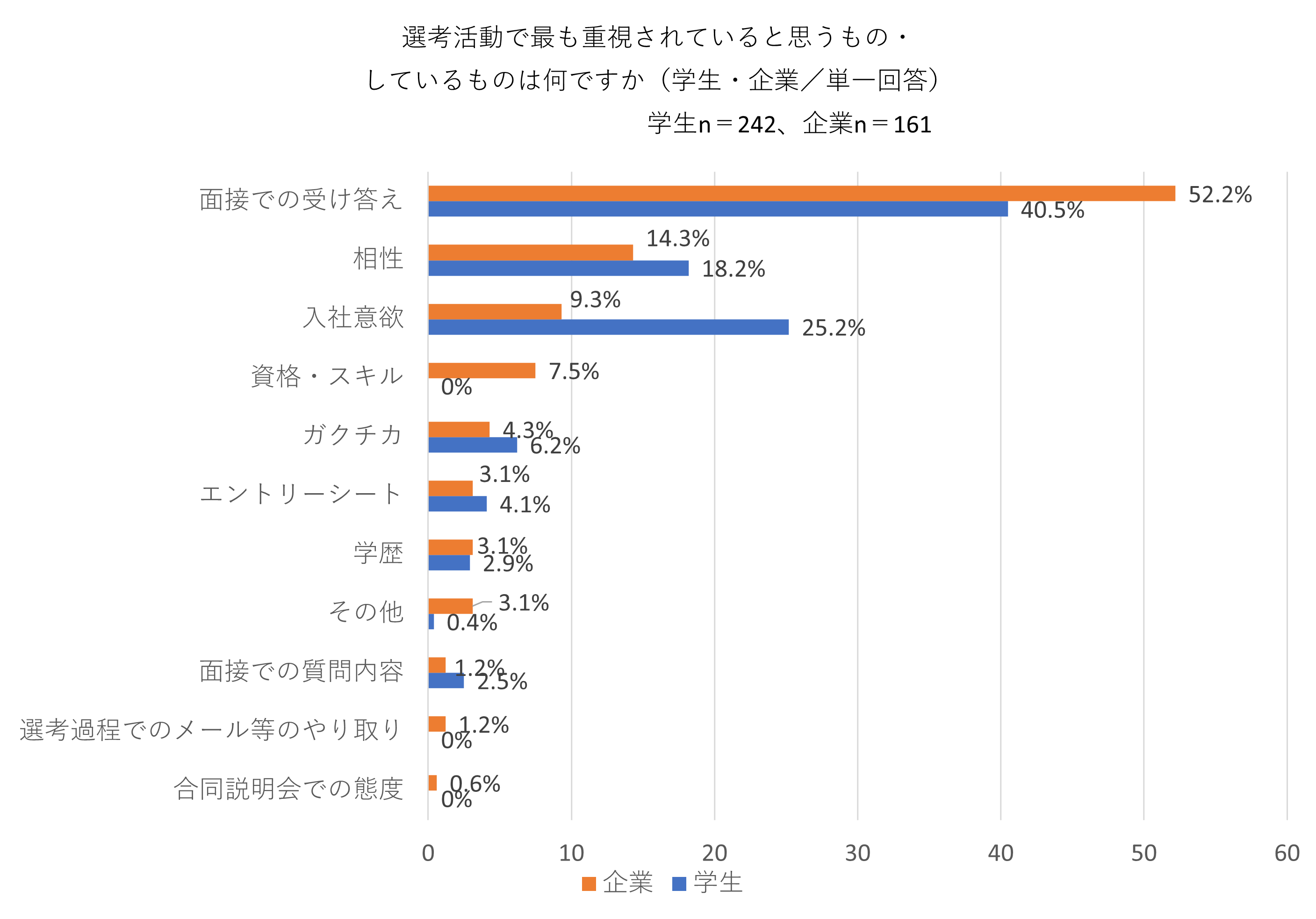 - 採用活動全体で企業が最も重視していると思うのは、1位:面接での受け答え(40.5%)、2位:入社意欲(25.2%)、3位:相性(18.2%)