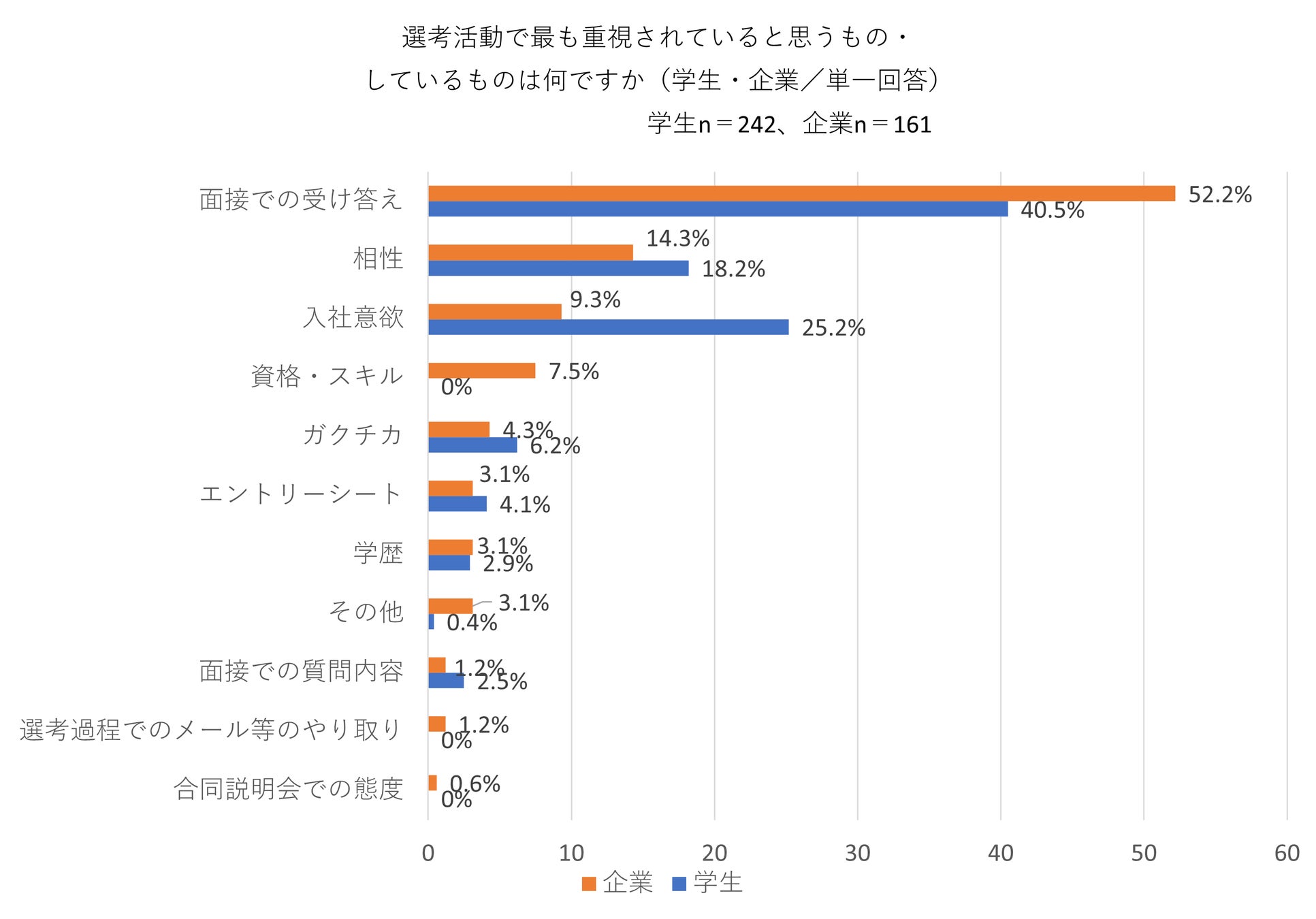 ②選考において、企業が最も重視する内容トップ3は、1位:面接での受け答え(52.2%)、2位:相性(14.3%)、3位:入社意欲(9.3%)なのに対し、学生のトップ3は、1位:面接での受け答え(40.5%)、2位:入社意欲(25.2%)、3位:相性(18.2%)の順に重視されると考えています。