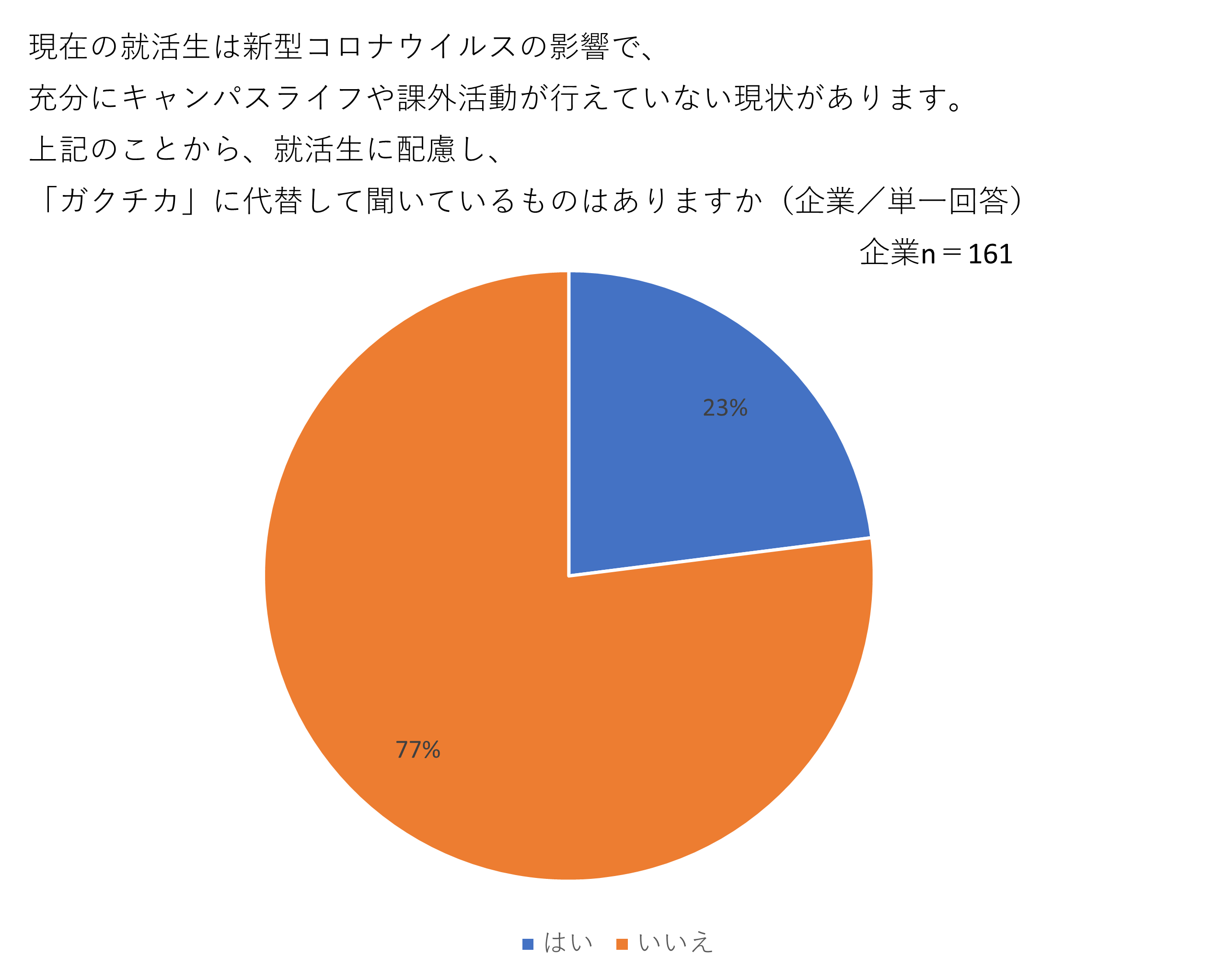 - 約8割(77.0%)はガクチカを代替する質問を設けていない実態。コロナ禍の影響で充分なキャンパスライフを送れていない学生に配慮していない傾向